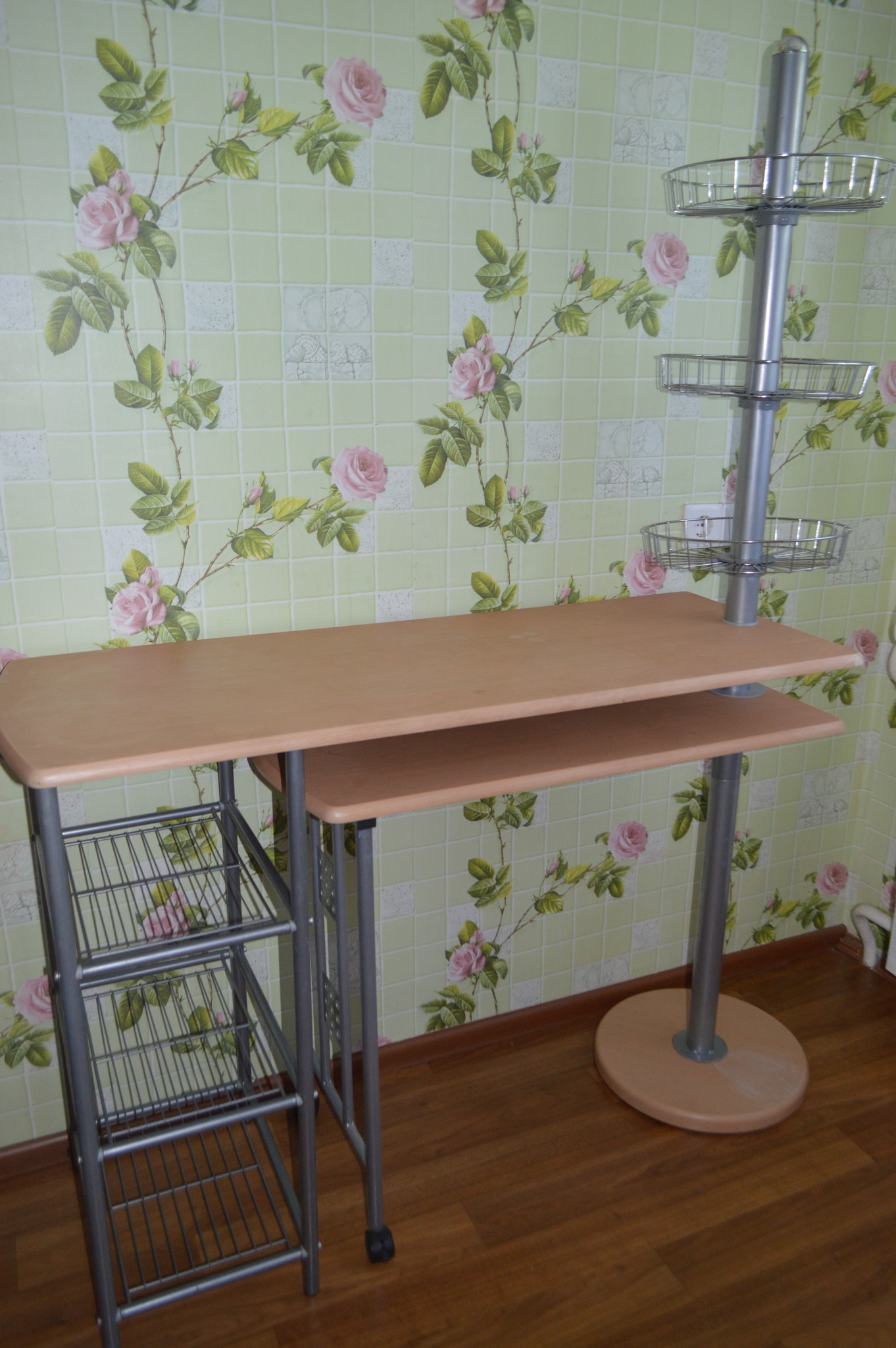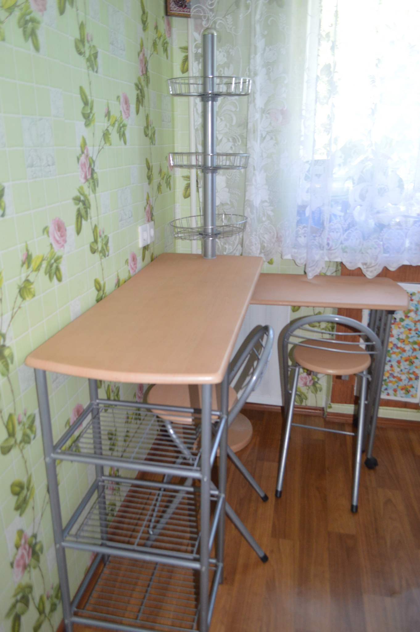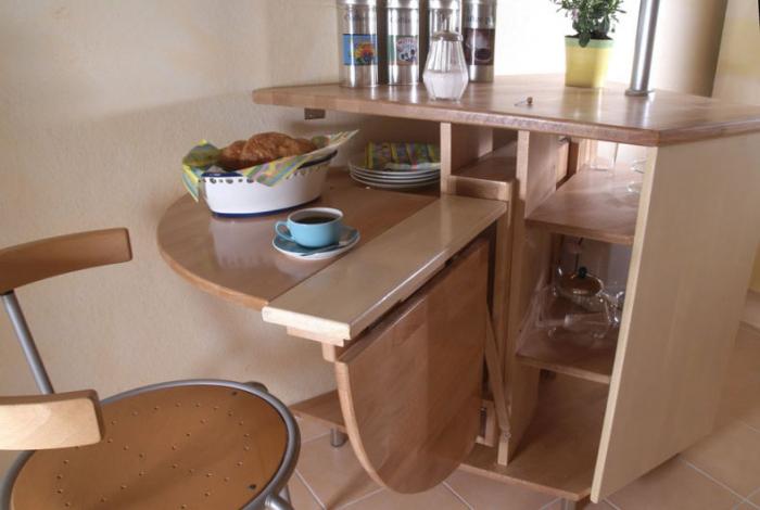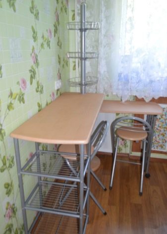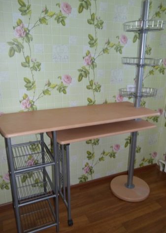 Ein Modell kann zwei Arbeitsplatten gleichzeitig haben: eine für das Frühstück, die andere für das Arrangieren von Geschirr, Gläsern, Küchenutensilien (zum Beispiel ein Behälter für Sahne, Salzstreuer, zusätzliche Geräte usw.). Der Verwandlungstisch kann auch mit einem Hochregal mit Metallfächern zur bequemen Aufbewahrung von Handtüchern, Servietten, einigen Produkten etc. ausgestattet werden.