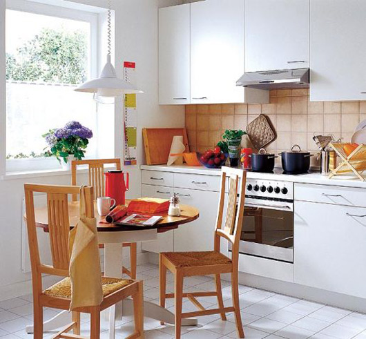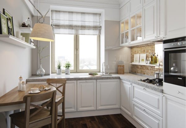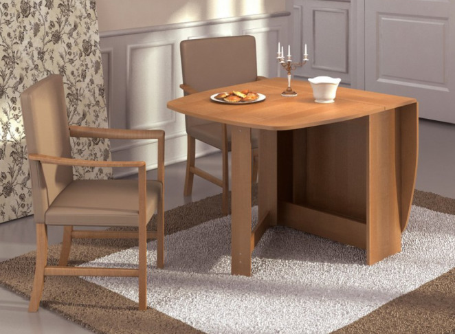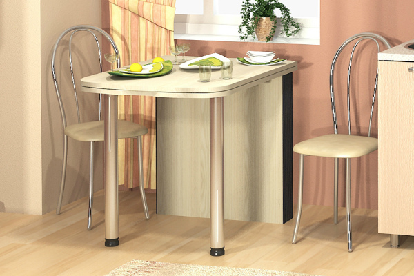 Die wirtschaftlichste Option ist das "Buch" -System. Es braucht nicht viel Platz in der Küche, es sieht frisch und originell aus. Die Tischplatte kann ihre Richtung von horizontal zu vertikal ändern.