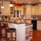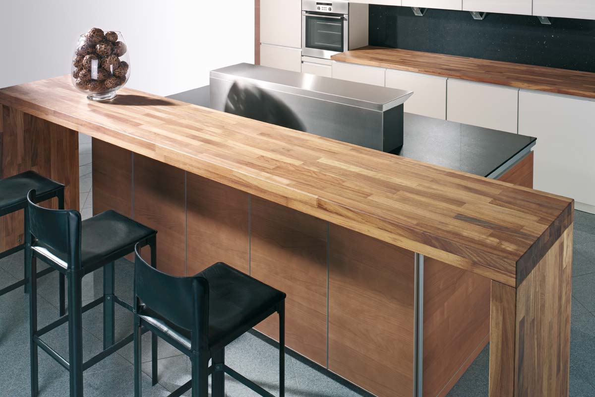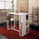 Ein Inseltisch von normaler Höhe kann leicht in eine mehrstufige Struktur umgewandelt werden. Dazu genügt es, einen weiteren Tisch auf kleinen Beinen einzubauen, der als Ständer für einen Laptop, ein Kochbuch oder einfach nur eine Tasse Kaffee dienen kann.