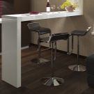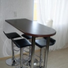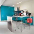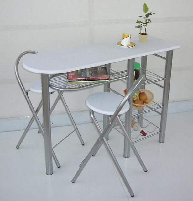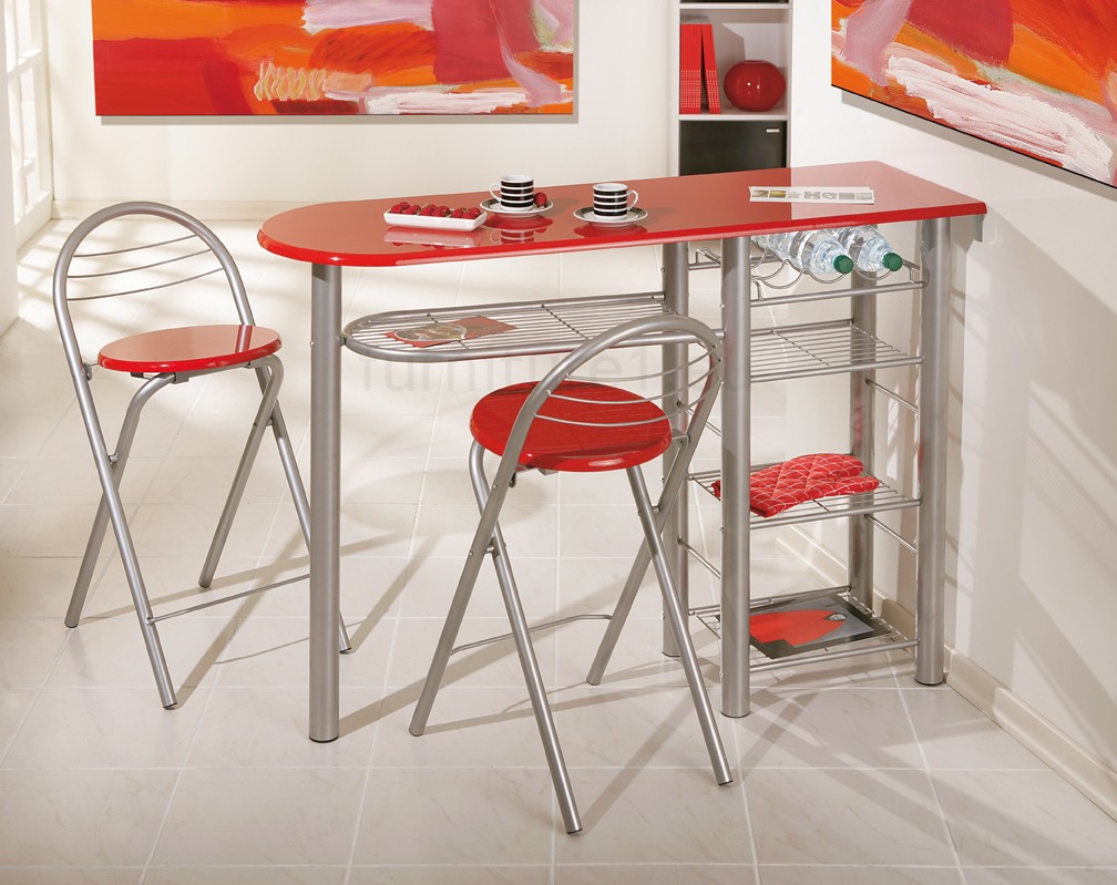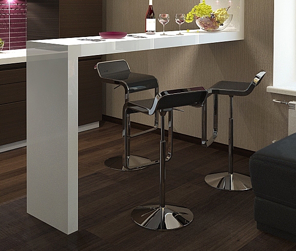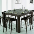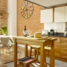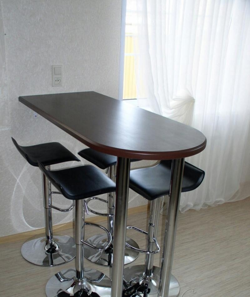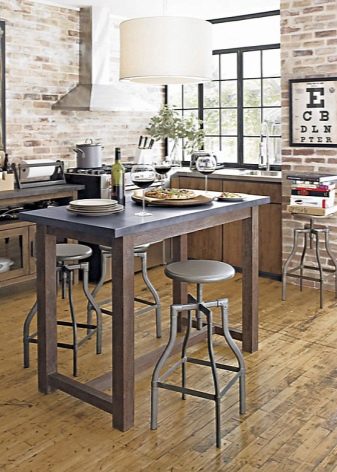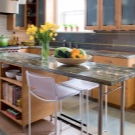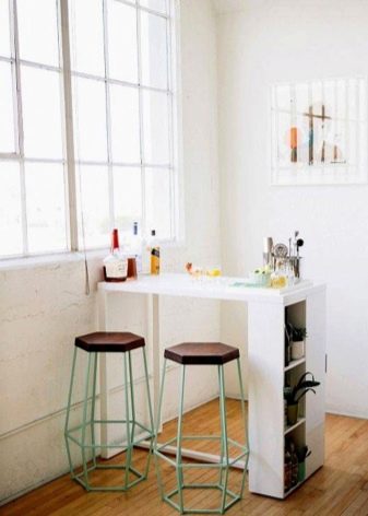 Bei der Auswahl eines Materials, aus dem ein hoher Tisch für eine kleine Küche hergestellt wird, sollte beachtet werden, dass das mobile Design vor allem Bewegungsfreiheit bedeutet, daher werden schwere, massive Details hier fehl am Platz sein. Sie machen schwerer und reduzieren den ohnehin kleinen Platz.