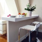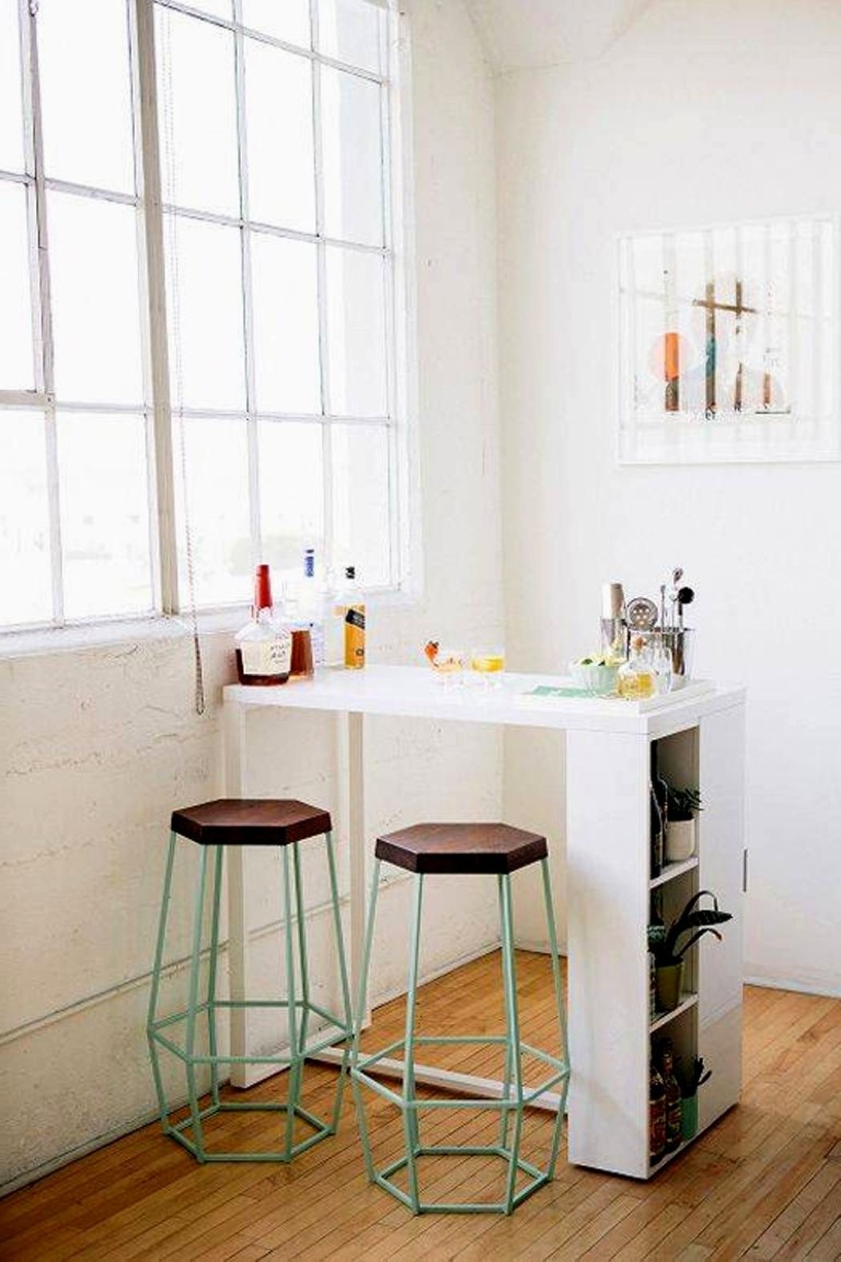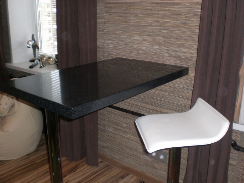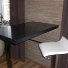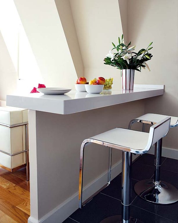 Als Naschplatz kann auch eine hohe, in Wandnähe ausgestattete Tischplatte verwendet werden. Es kann als reguläres Regal an der Wand befestigt oder mit einer zusätzlichen schenkelförmigen Auflage für mehr Sicherheit ausgestattet werden.Solch ein Tisch ist eine ausgezeichnete Lösung für das Zuhause einer einzelnen Person oder eines jungen dynamischen Paares, das wenig Zeit zu Hause verbringt und für das Essen in einer Wohnung auf ein leichtes Frühstück oder Abendtee beschränkt ist.