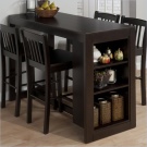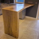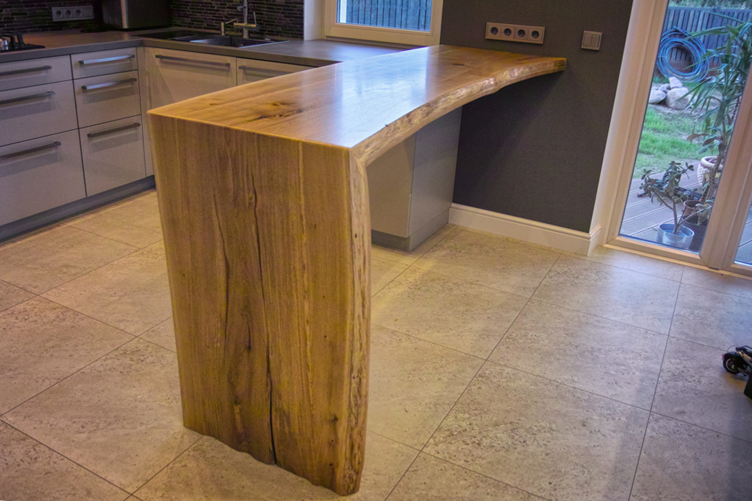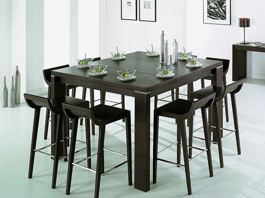 Eines der Elemente einer mehrstöckigen Küche ist der Esstisch. Es wird oft höher als die Standardhöhe der übrigen Küchenmöbel gemacht. Ein typisches Beispiel für einen hohen Küchentisch ist der Bartresen. Ihr Hauptvorteil ist, dass sie sich sowohl für große, geräumige Küchen als auch für kleine Räume eignet.