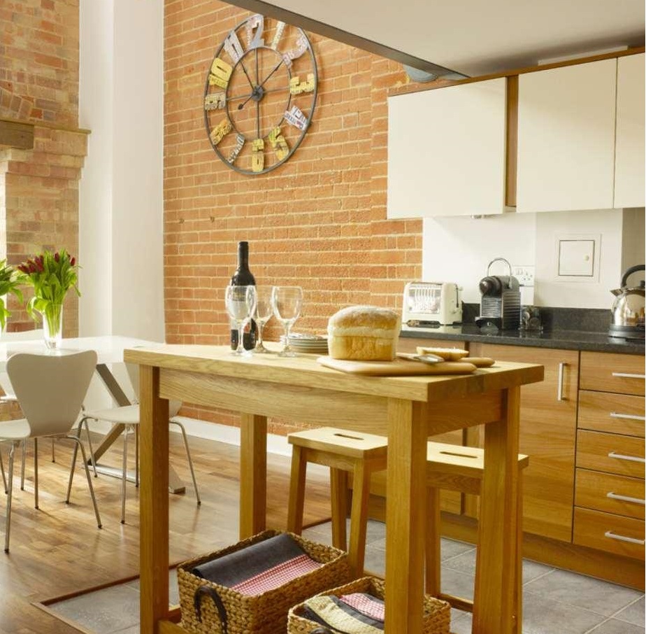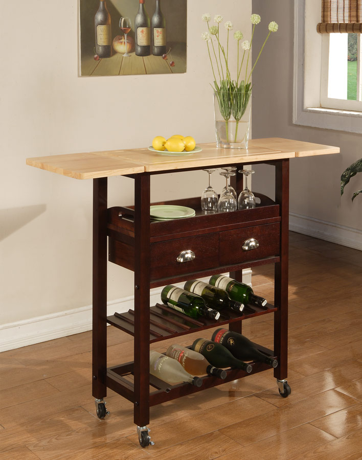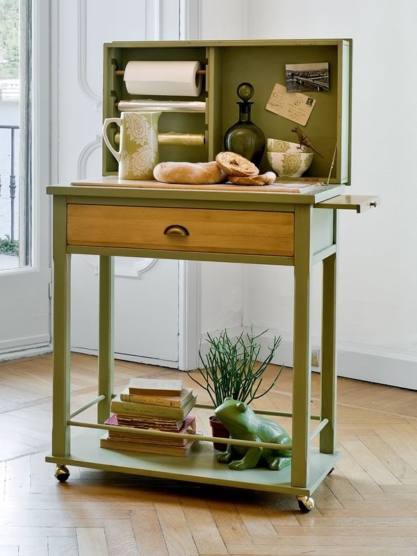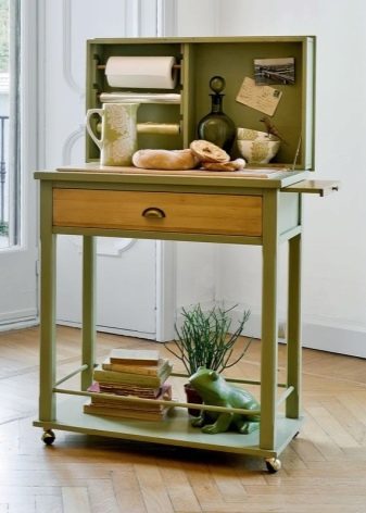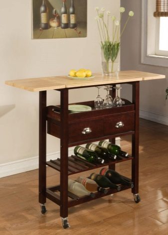 Für kleine Wohnungen gibt es auch einen Klapptisch auf Rädern, der gegen die Wand geschoben werden kann, so dass die Tischplatte über dem Bodenschrank steht. Wenn die Gäste ankommen, können sie in den Raum oder in die Mitte der Küche gerollt werden.