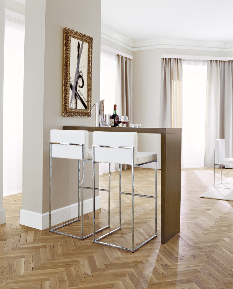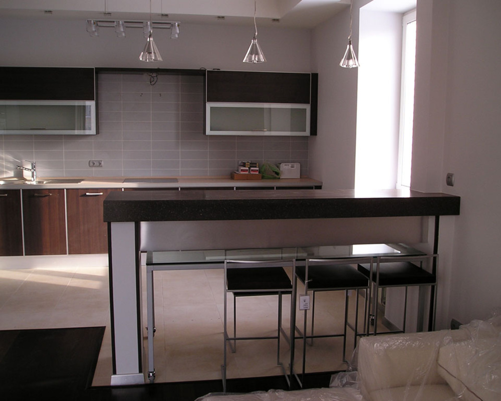 Optionen für die Leiste können einige sein. In einer Studiowohnung kann sie durch die Installation einer Theke einen Raum in zwei funktionale Zonen unterteilen und gleichzeitig die Rolle eines Esstisches übernehmen. Und wenn Sie es mit unteren Regalen oder Schubladen bestücken, kann ein solcher Tisch auch als Aufbewahrungssystem dienen.