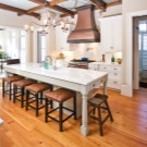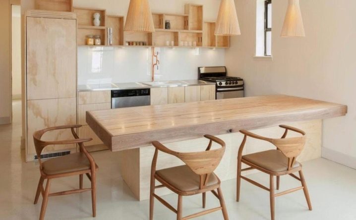 Viele bevorzugen Holzprodukte nur, weil sie sich perfekt an jedes Interieur anpassen. Die Wunder der Möbelanpassung aus massivem Holz, sowohl in bescheidenen Quadratmetern als auch in respektablen Wohnungen, sind wirklich beeindruckend. Aus einem so vielseitigen Material werden nicht nur bequeme Betten, Kleiderschränke, Bücherregale, sondern auch Sets wie Küchenstühle erhalten. Das Futter von Scheunenbrettern, verrückt exotisch in Kombination mit Stein, Glas, traditionellen Holzelementen - all dies wird sicherlich die Innenräume jeder Küche schmücken.