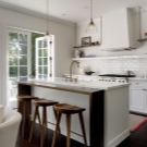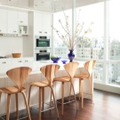 Für die Küche können Sie die klassische Version mit Armlehnen, eine bequeme Rückenlehne erwerben. Geben Sie auch keine hölzernen Stühle auf. Stellen Sie in diesem Fall sicher, dass sie leicht unter den Tisch geschoben werden können. Barhocker mit Fußständer schmücken das Loft-Interieur, den Stil von Minimal oder High-Tech.