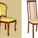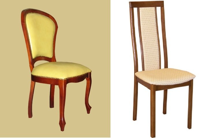 Ein gewöhnlicher Stuhl mit einem weichen oder harten Sitz kann mit Kunstleder, Samt oder Velours bezogen werden. Und Sie können eine solche Manipulation mit dem Rücken und den Beinen machen, einschließlich. Als Füllstoff kommen viele Modelle mit Schaum, Assembledx, Spunbond, Polyurethanschaum usw. Assex ist am widerstandsfähigsten und komfortabelsten und Spunbond ist umweltfreundlich.