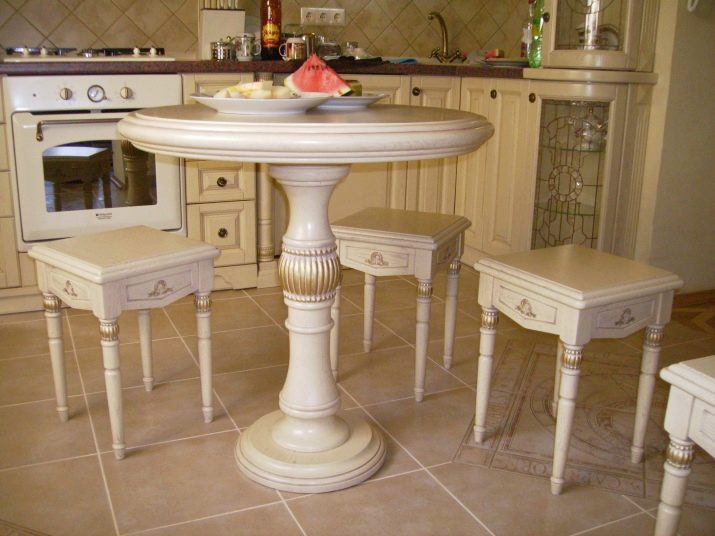 Je dichter die Materie, desto leichter absorbiert sie Fremdgerüche. Und die Küche ist eine ausgezeichnete Quelle von Aromen von exotischen und traditionellen Gerichten, Kinder, Gari, usw. In spezialisierten Geschäften oder Online-Shops können Sie hohe und niedrige Modelle mit provenzalischer Alterung kaufen. Produkte können Metallbeine, Spitze, Velourssitze oder einen neugierigen Druck (Fotodruck) verzieren.