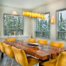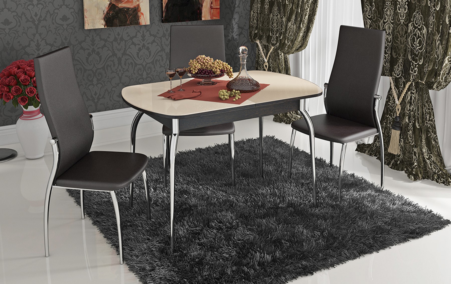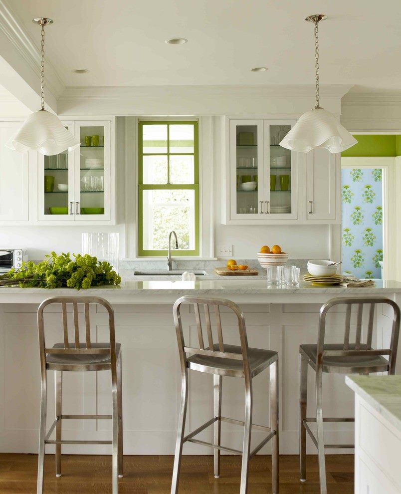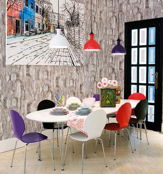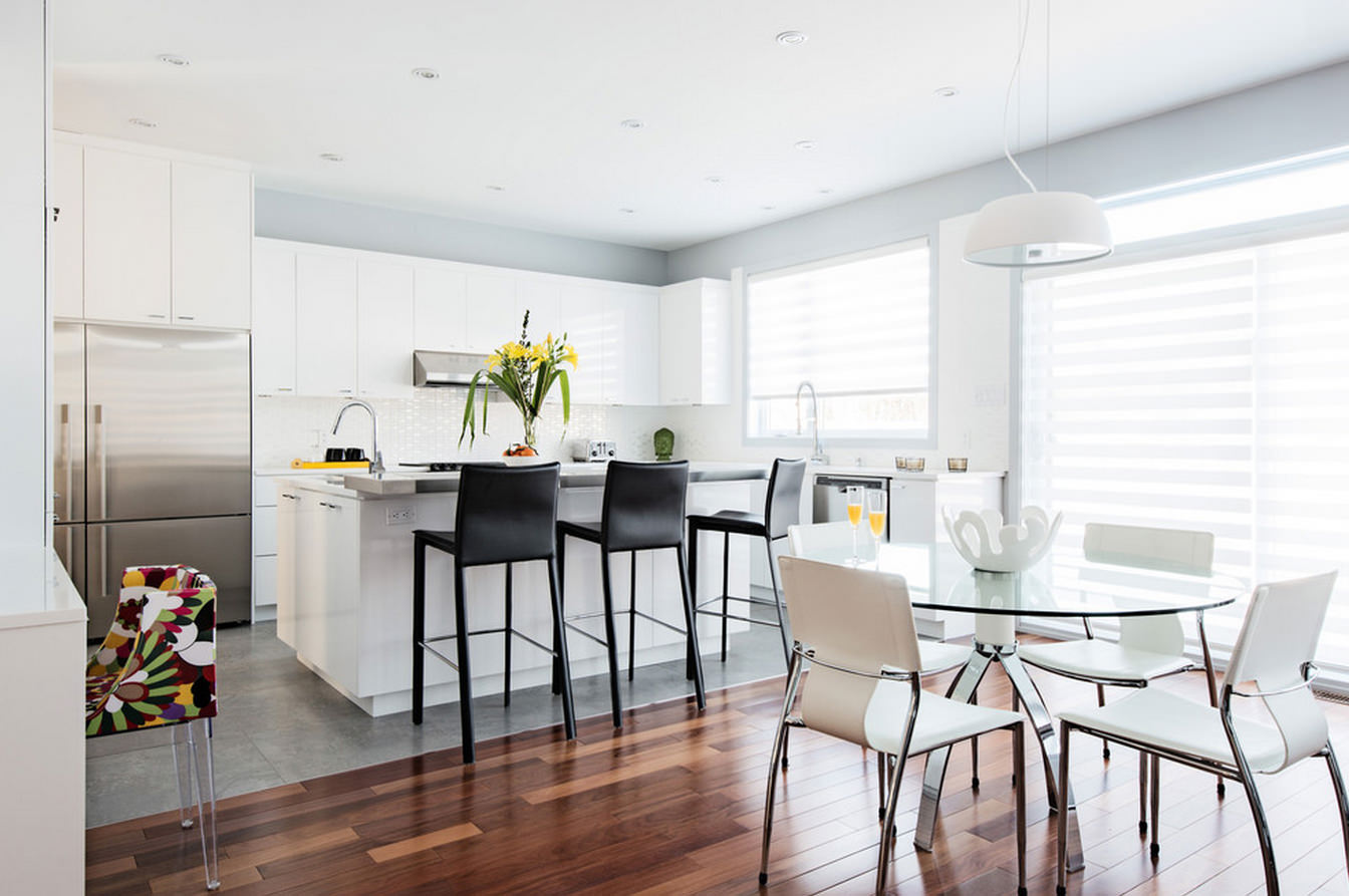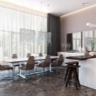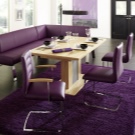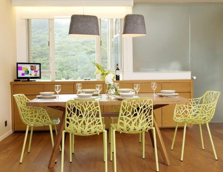 Die Farbe und das Design der Stühle sollte mit dem Rest des Raumes übereinstimmen. So sehen Stühle mit Textilbezug in einem klassischen Interieur gut aus und harmonieren perfekt mit der Holzstruktur des Headsets. Ein Stuhl aus transparentem Kunststoff eignet sich gut für den Glastisch mit den gleichen Metallbeinen.