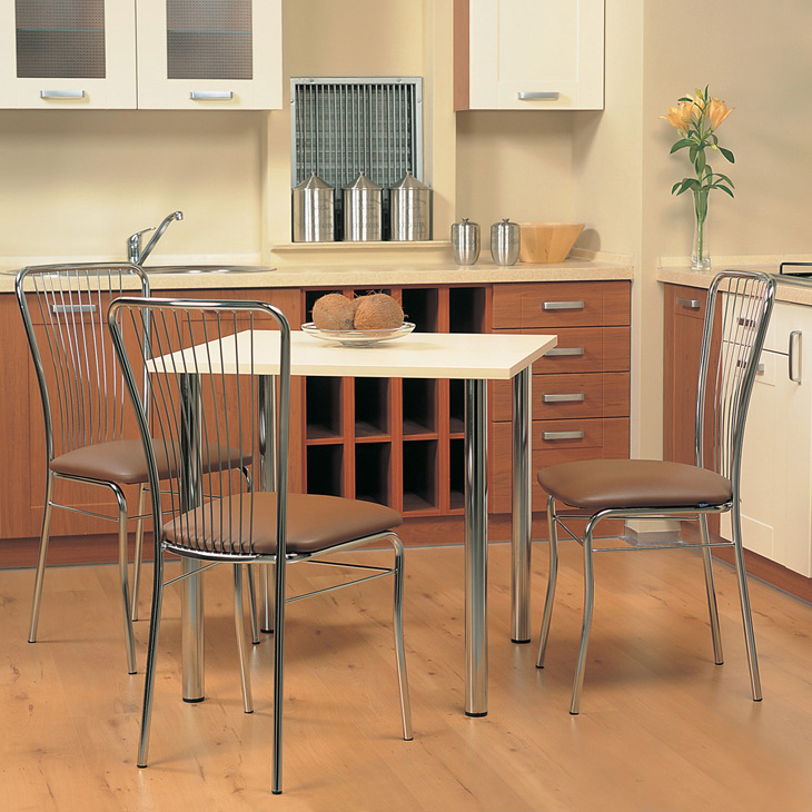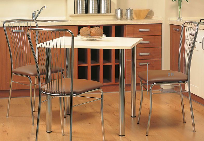 Die Möbel auf dem Metallrahmen für die Küche sind aus Aluminium- oder Stahlrohren, die je nach Vorstellungsgabe des Designers in verschiedenen Formen erhältlich sind. Das Endprodukt ist mit mehreren Schichten Chrom oder Farbe beschichtet. Oft sind Chrombeine mit zusätzlichen dekorativen Elementen aus Rohren kleineren Durchmessers verziert.