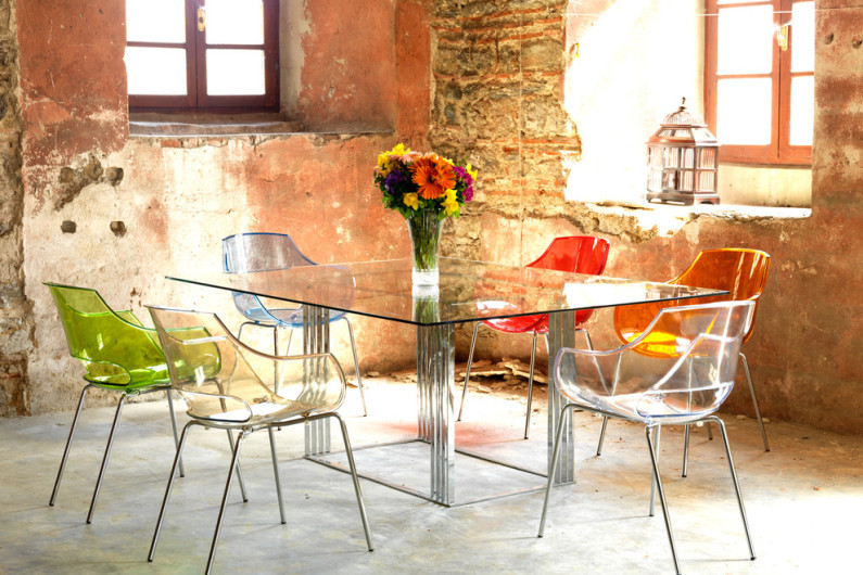 - Die Kombination von Plastiksitzen und Metallbeinen in Möbeln ist die praktischste und eine der häufigsten Wahlmöglichkeiten für die Küche. Diese Materialien sind leicht zu pflegen, haben keine Angst vor Feuchtigkeit und hohen Temperaturen. Moderne Technologien erlauben die Plastizität, um die meisten unerwarteten Biegungen und Formen zu geben.Zufrieden mit der Auswahl und Farbpalette von Kunststoffsitzen. Dies ist eine gute Option nicht nur für eine Stadtwohnung, sondern auch für ein Sommercafé, sowie eine offene Veranda eines Landhauses. Eine der Kunststoffsorten ist Polycarbonat. Produkte daraus in den letzten Jahren werden immer beliebter. Es gilt als ein haltbareres Material als Kunststoff. Stühle aus Polycarbonat können einer Person mit einem Gewicht von ca. 200 kg standhalten.