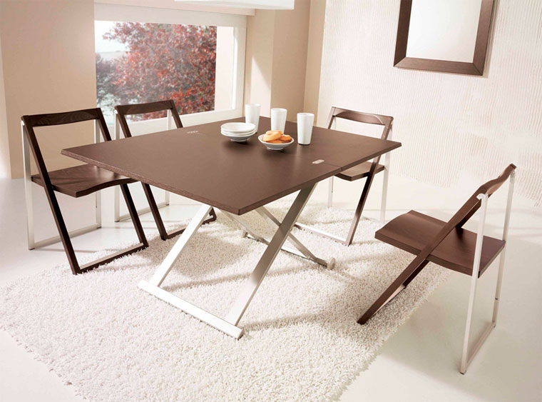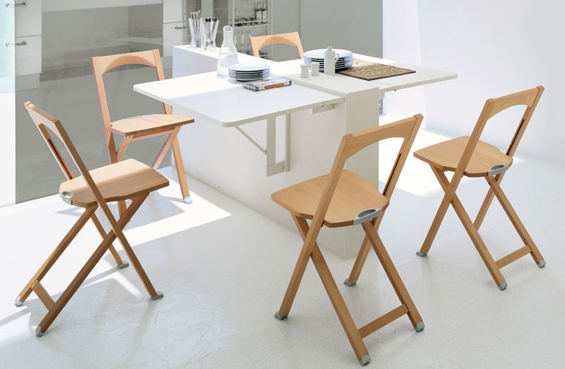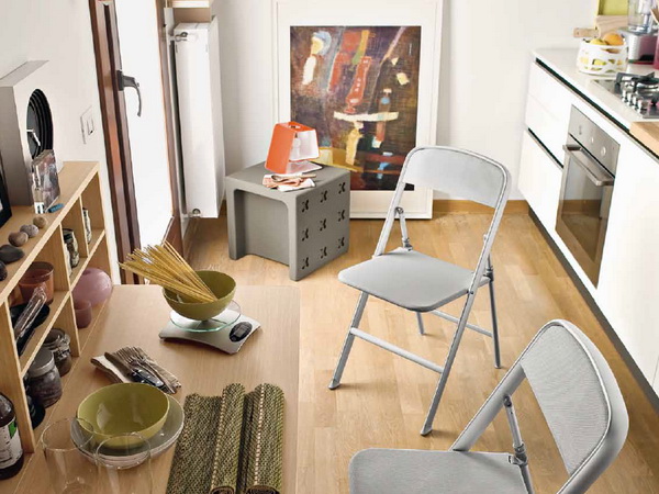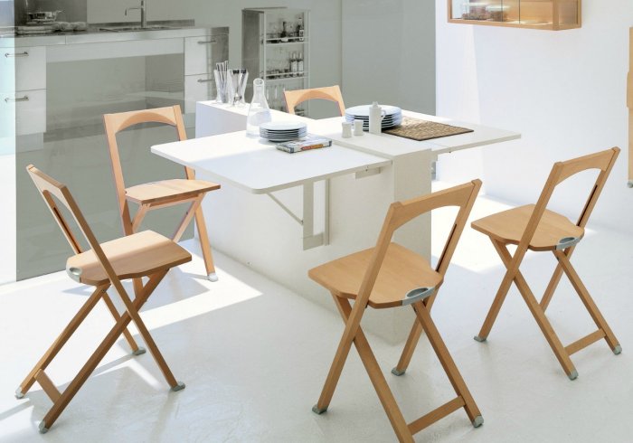 Der Raum im Haus ist eine strategische Ressource, die sowohl die Lebensqualität als auch die Familienbeziehungen beeinflusst. Um es zu sparen, können Sie Klappstühle mit einem Rücken für die Küche verwenden, deren Nutzung nicht dauerhaft möglich ist.