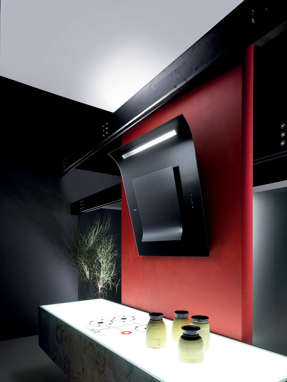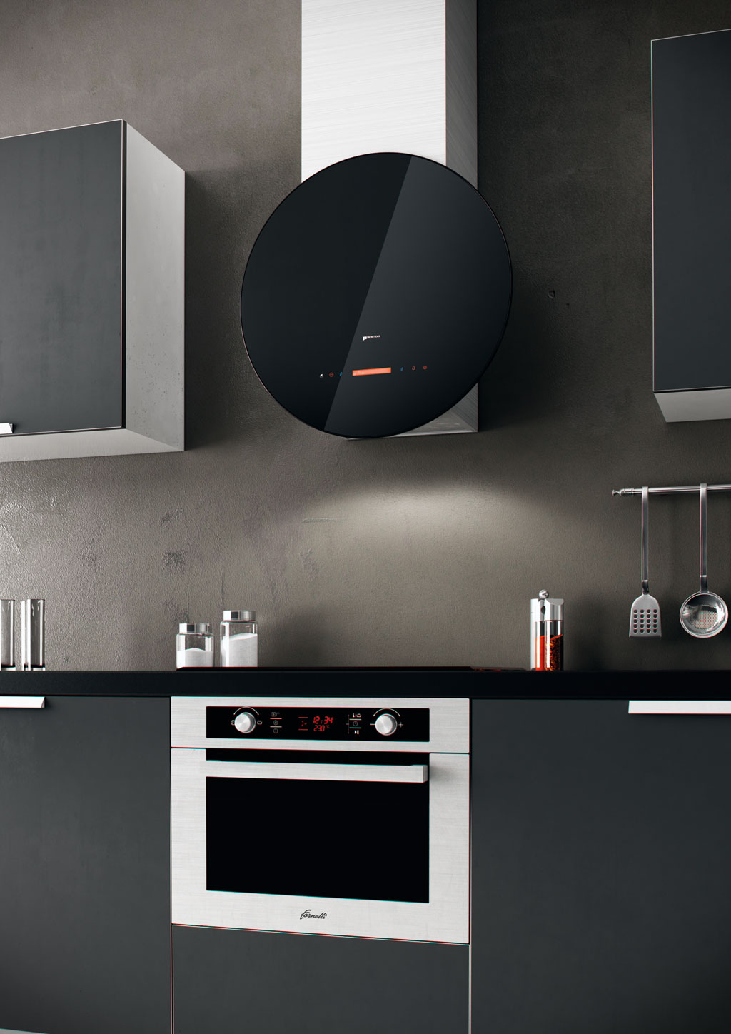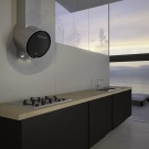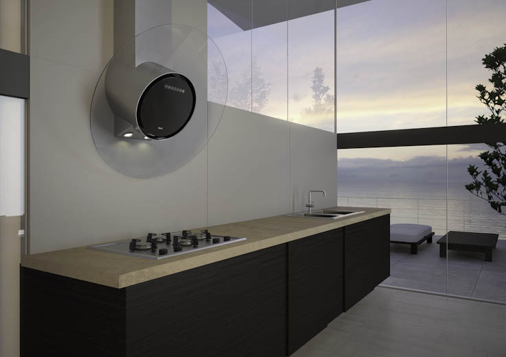Geneigte Kapuze mit einer gebogenen Hemisphäre fügt einem modernen Küchendesign einen geometrischen Akzent hinzu.