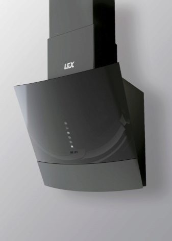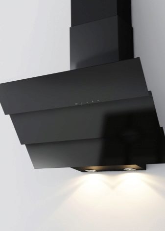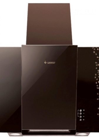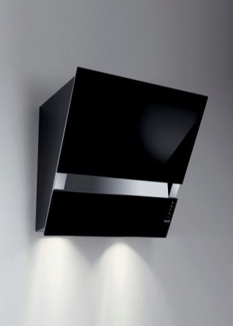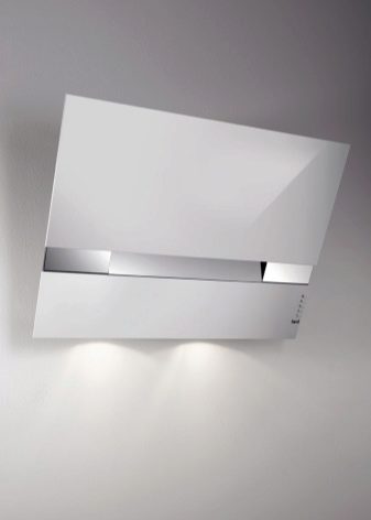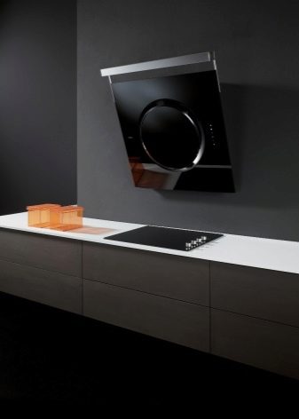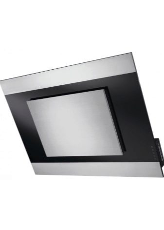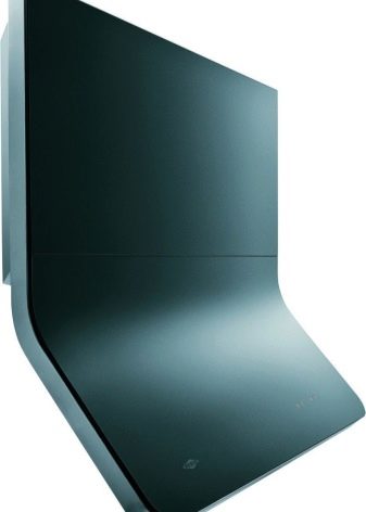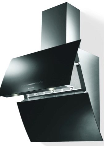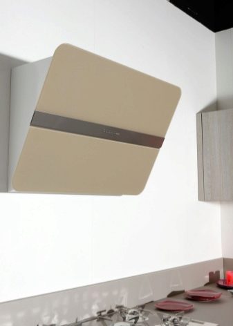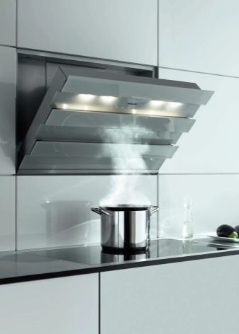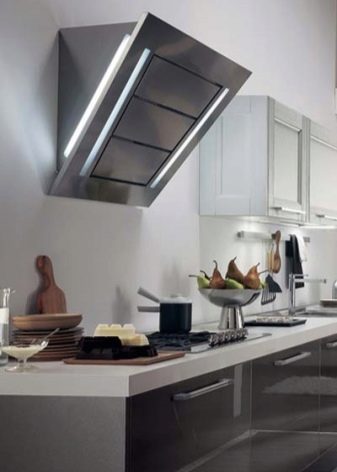 Der Name dieser Extrakte spricht für sich. Die Arbeitsfläche befindet sich im Gegensatz zum Gewöhnlichen in einem Winkel zur Platte. Dies ermöglicht es, den Raum über dem Kochfeld zu vergrößern. Nichts verhindert das Stehen in der Nähe des Ofens.
