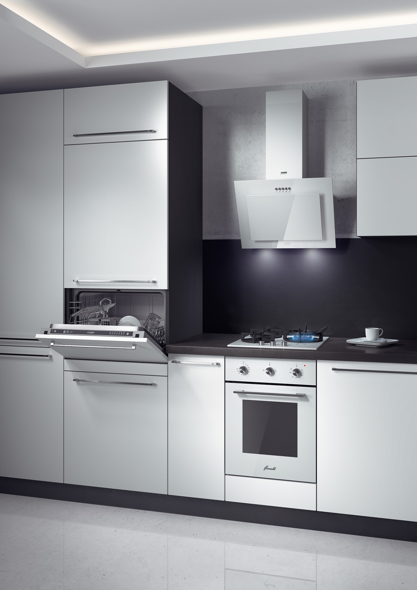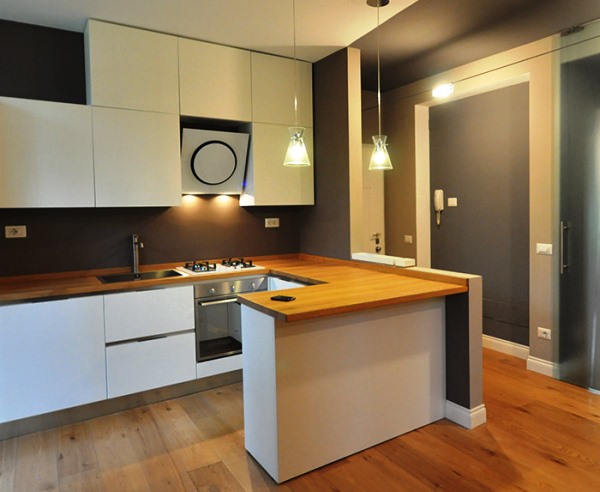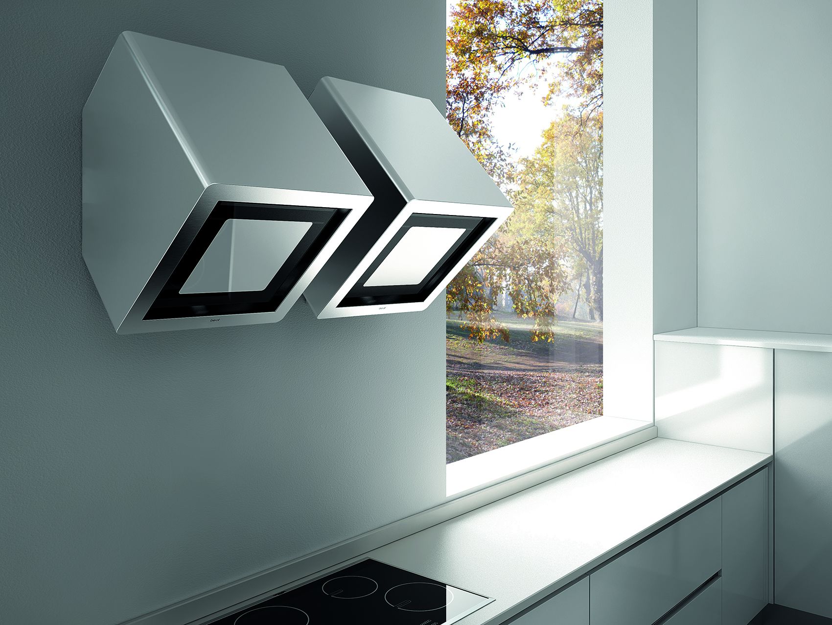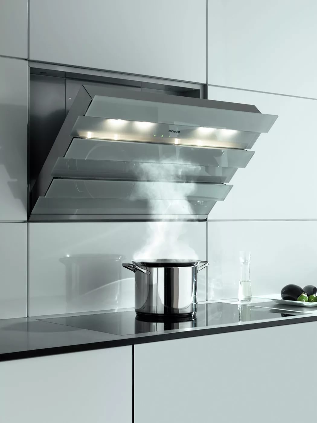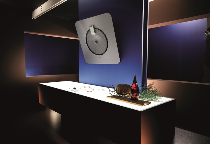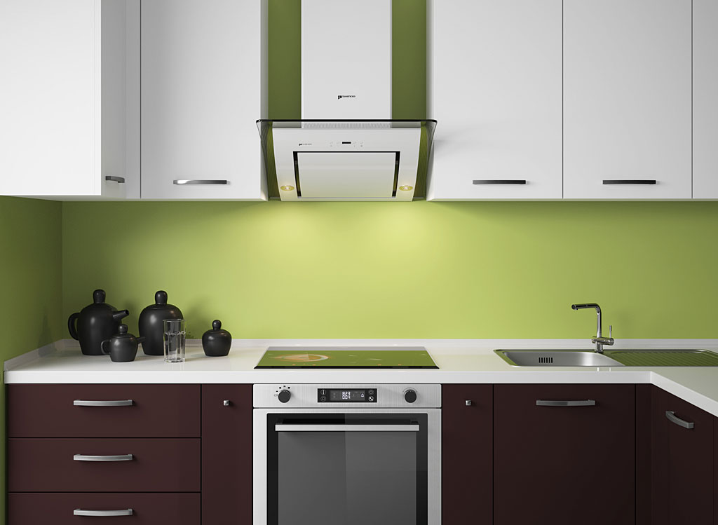 Selbst in der kleinsten Küche passt sich eine Schräghaube mit selbstreinigendem Luftsystem wunderbar an, ohne den Raum mit einer Lüftungsbox zu behindern.