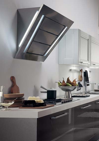 Moderne geneigte Dunstabzugshaube ist nicht nur ein Luftreiniger, sondern auch ein stilvolles Accessoire für die Küche.Und seine Ergonomie erlaubt es, dieses Gerät auf jeder, sogar der kleinsten Küche zu platzieren.