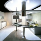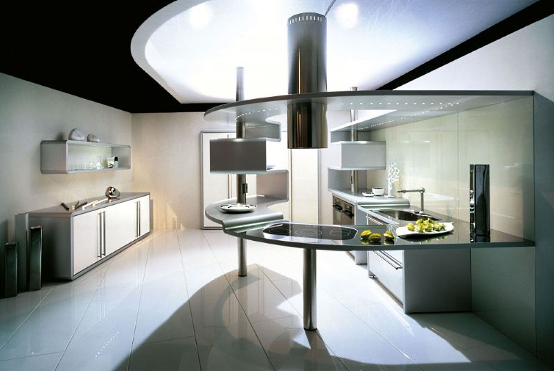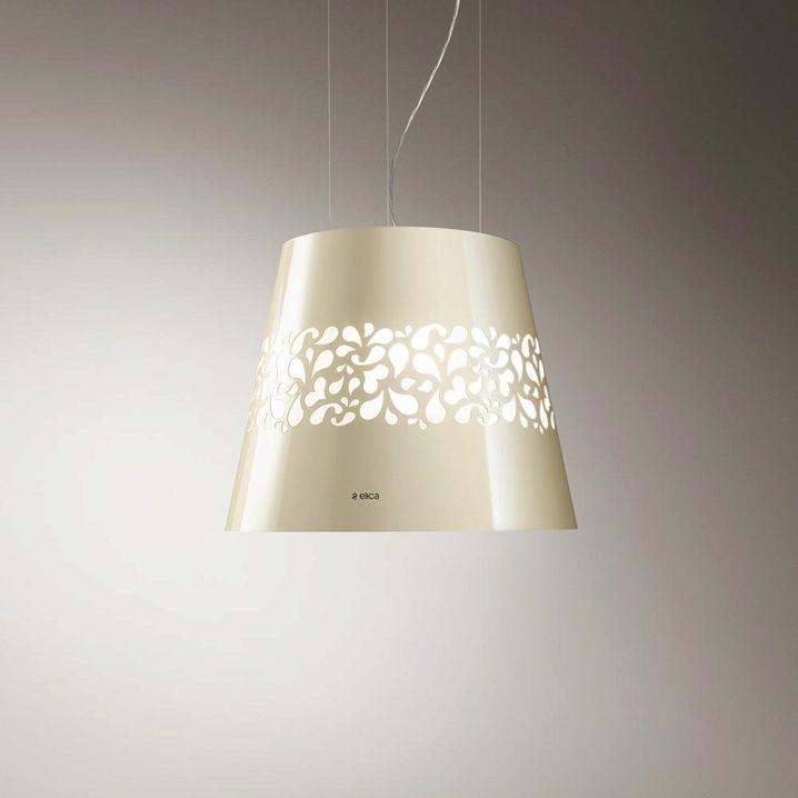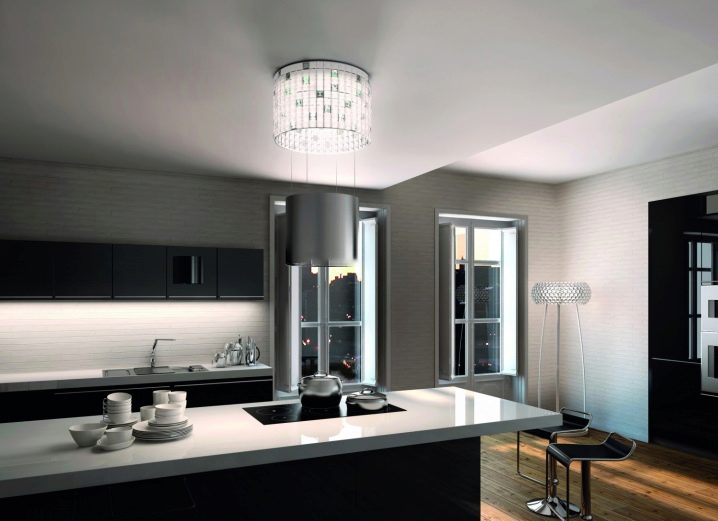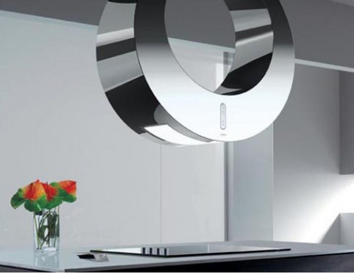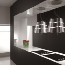 Schöne moderne Dunstabzugshaube sieht stilvoll aus und ist das Thema des Interieurs.Das Inselmodell unterscheidet sich von dem üblichen, das verschiedene Stile und Trends, Materialien und Formen kombiniert. Es kann rund, oval sein und futuristischen Elementen ähneln. Beliebte Hersteller tun alles, um den Käufer interessante und ungewöhnliche Neuheit zu interessieren.