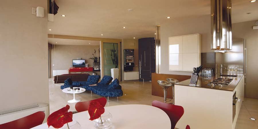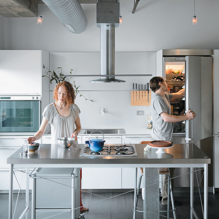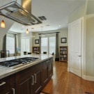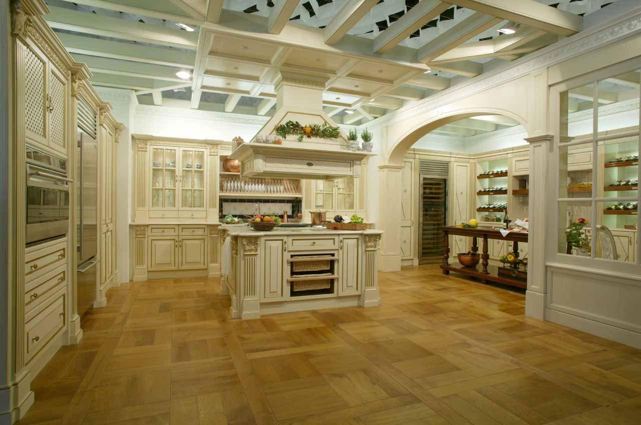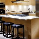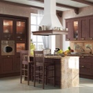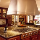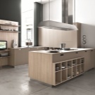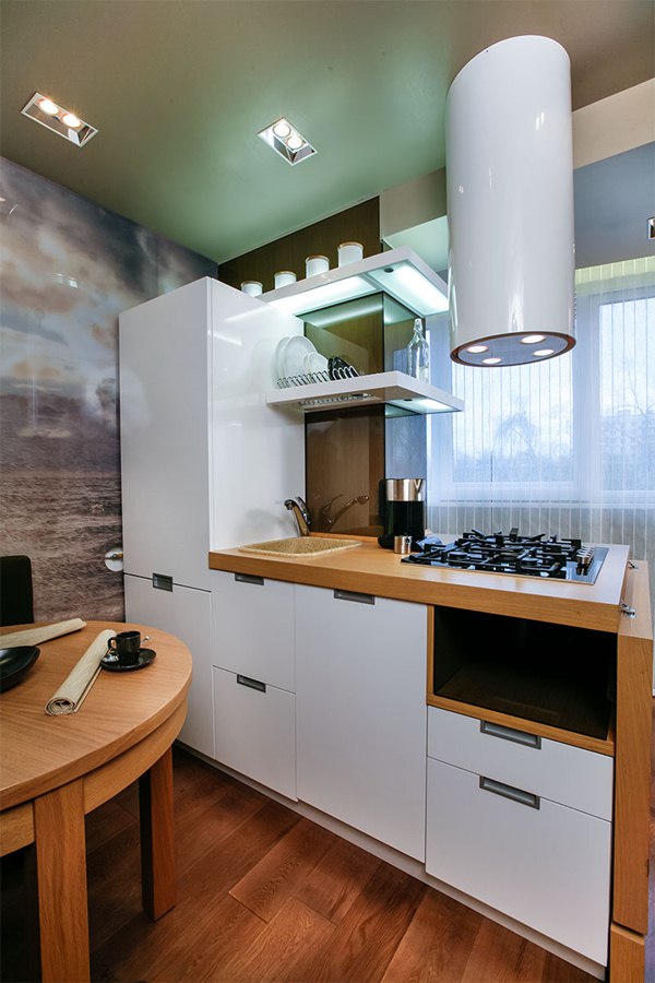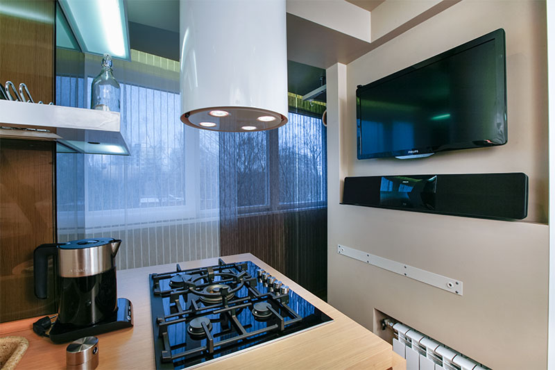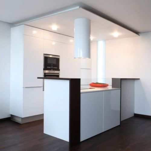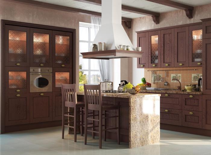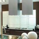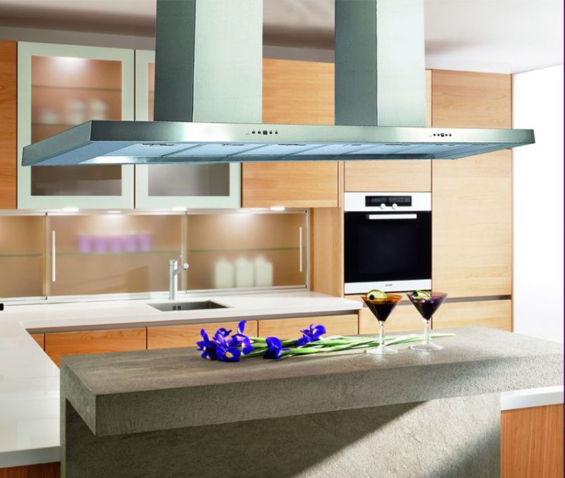 Die Insel hat eingebaute Geräte, einen Gefrierschrank, eine Mikrowelle und ein wesentliches Element - eine Inselhaube. Diese Küchenstruktur ist nicht an der Wand, sondern an der Decke und weit von den Wänden entfernt. Der Standort für die Haube wird unter Berücksichtigung des Arbeitsbereiches gewählt. Das Hauptmerkmal des Designs - die Art der Befestigung. Die Haube ist an der Decke befestigt. Es sollte nicht gespannt und aufgehängt werden, da das Gewicht des Inselgerätes mehr als 30 Kilogramm beträgt.