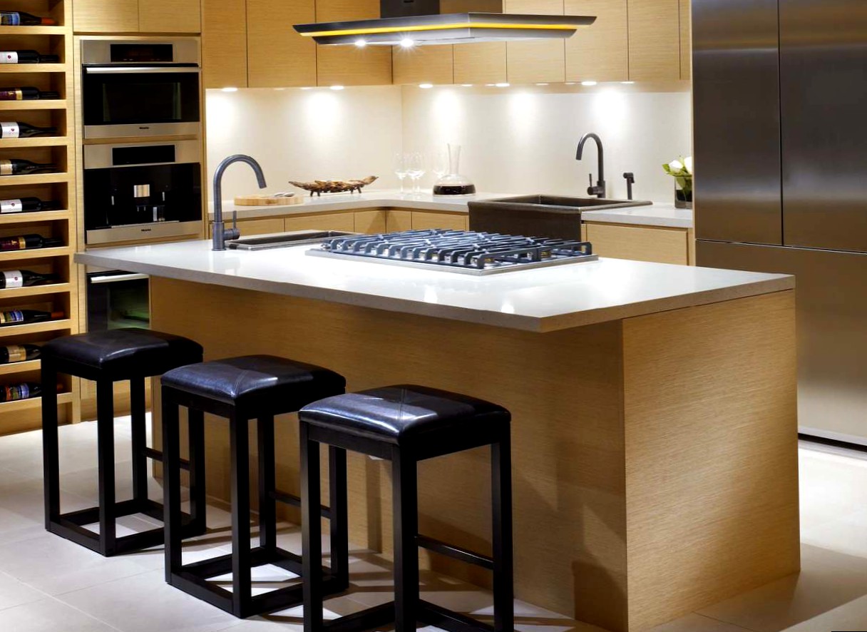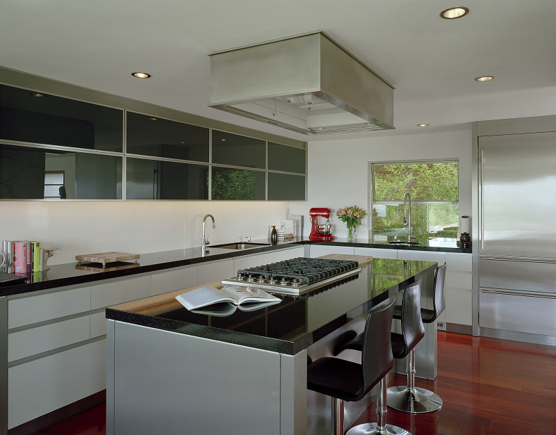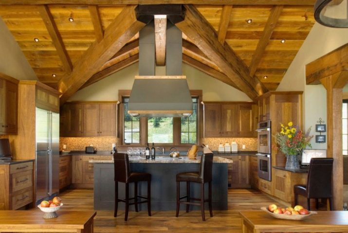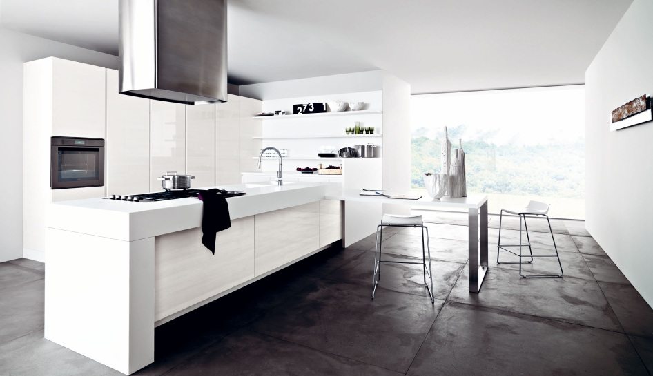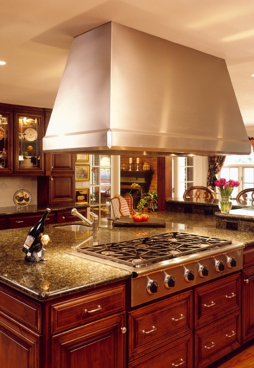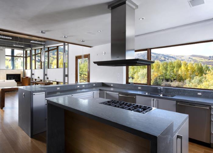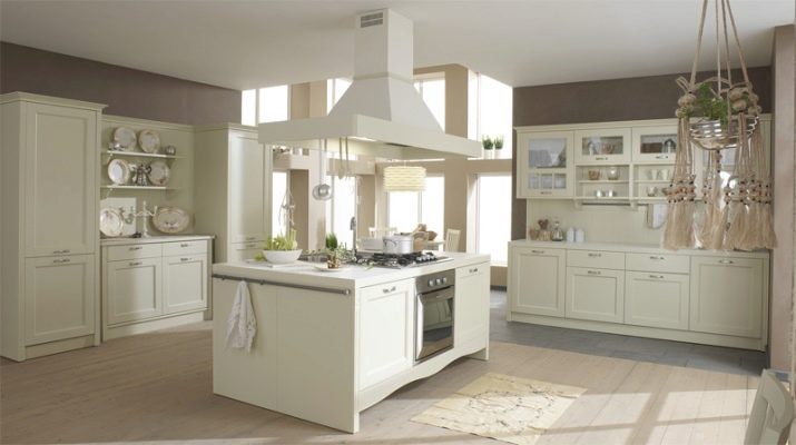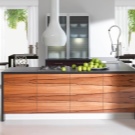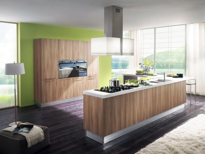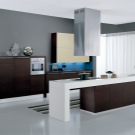 Wenn die Küche geräumig ist, und der Bereich erlaubt Ihnen, zu experimentieren, ein einzigartiges Design schaffend, empfehlen Experten, ein Kochfeld in der Insel zu legen, zum Beispiel, es kann der zentrale Teil der Küche sein. Die Inselhaube ist eine modische und originelle Lösung, mit der Sie die Kochzone in die Mitte des Raumes bewegen können. Inselauszüge eignen sich für Räume mit einer Fläche von mehr als 20 qm. In der Insel Herd, Backofen, Arbeitsplatte, Waschbecken.Wenn alle Hauptelemente des Arbeitsbereiches zusammen sind, müssen Sie separat Wasser und Abwasser mitbringen.