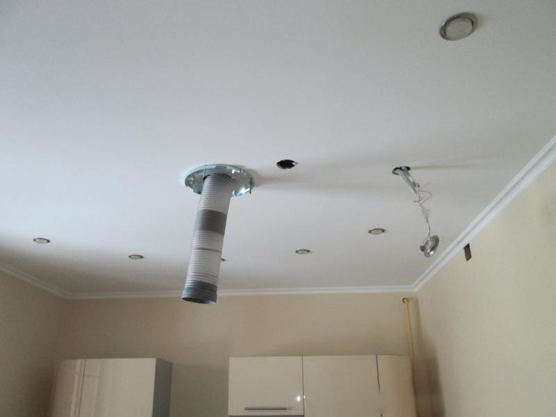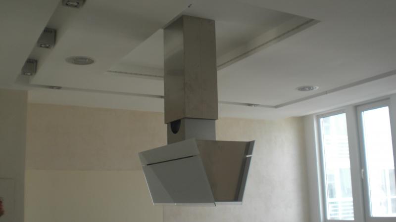 Die Haube ist nur an der Hauptdecke montiert! Die Installation einer Inselstruktur auf dem Scharnier ist ein kostspieliger und unsicherer Vorgang. Wenn Sie es auf einer Scharnierkonstruktion installieren, müssen Sie die Decke während der Installation zerlegen.