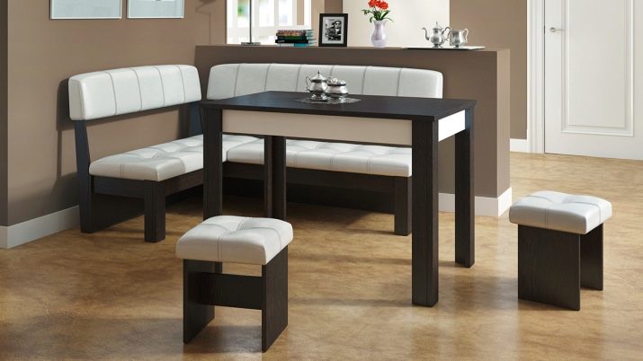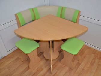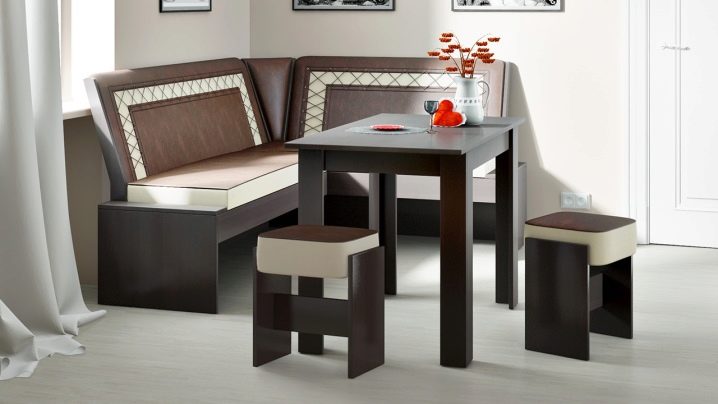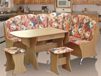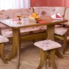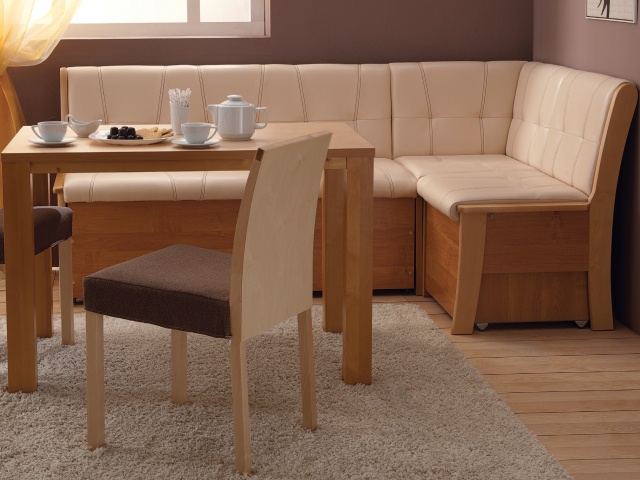 Es wird für Küchen nach zwei Prinzipien ausgewählt - Haltbarkeit und Beständigkeit gegen Fett und Reinigungsmittel. Low-Cost-Optionen kommen immer mit Kunstleder, das teuerste - mit echtem Leder. Andere populäre Materialien für die Polsterung sind: