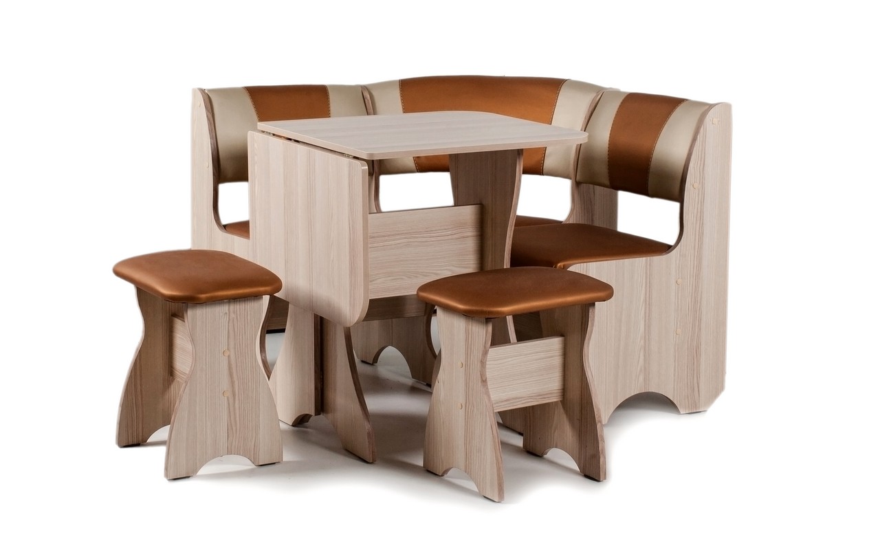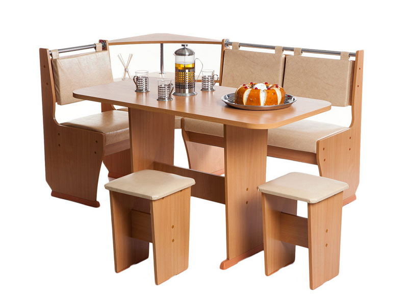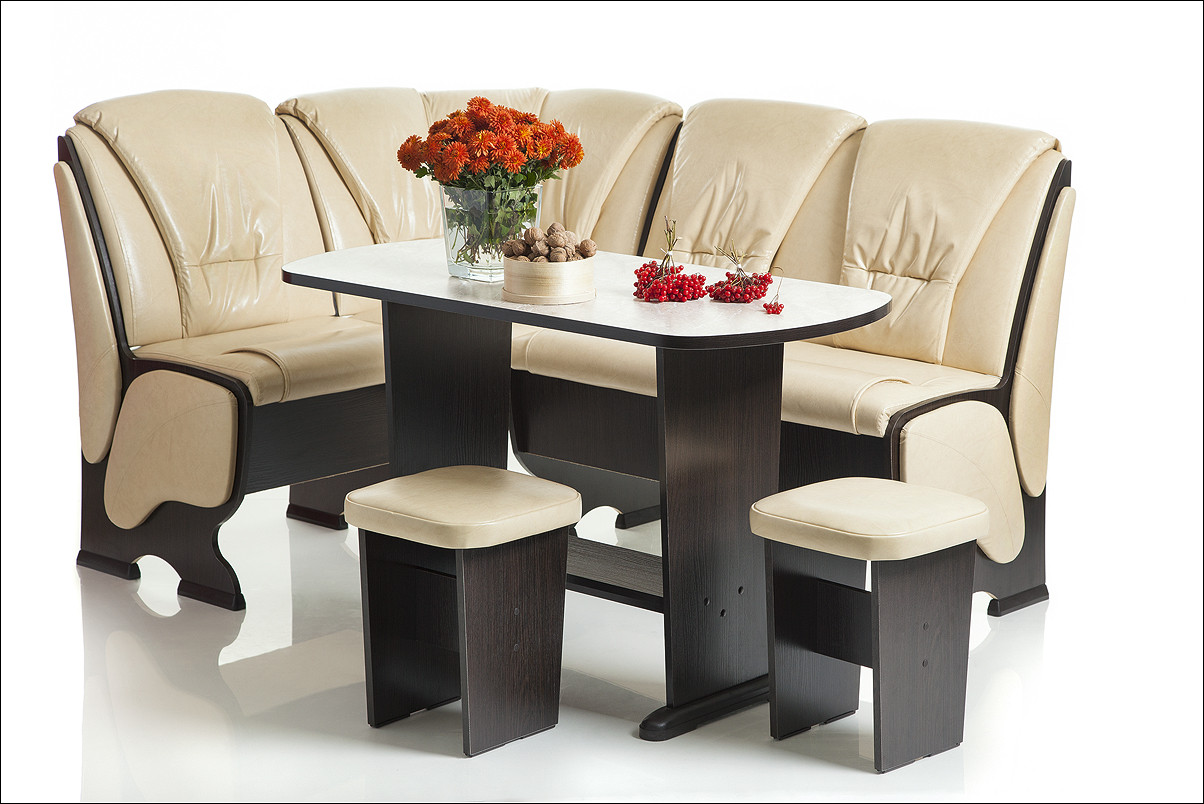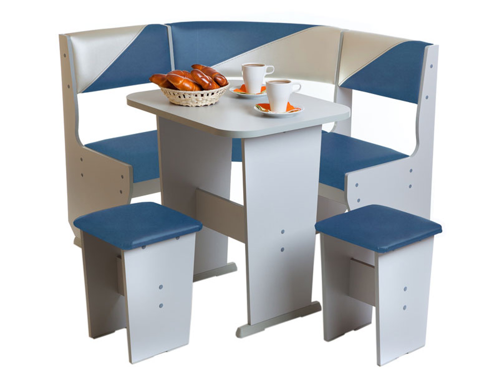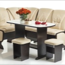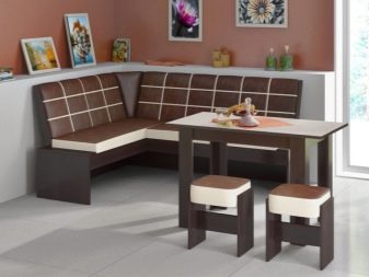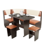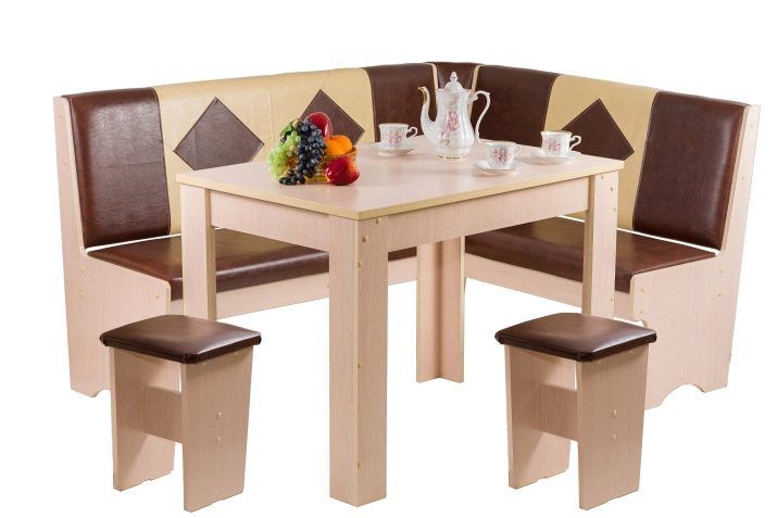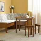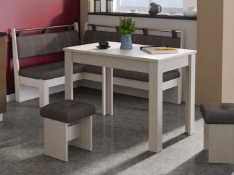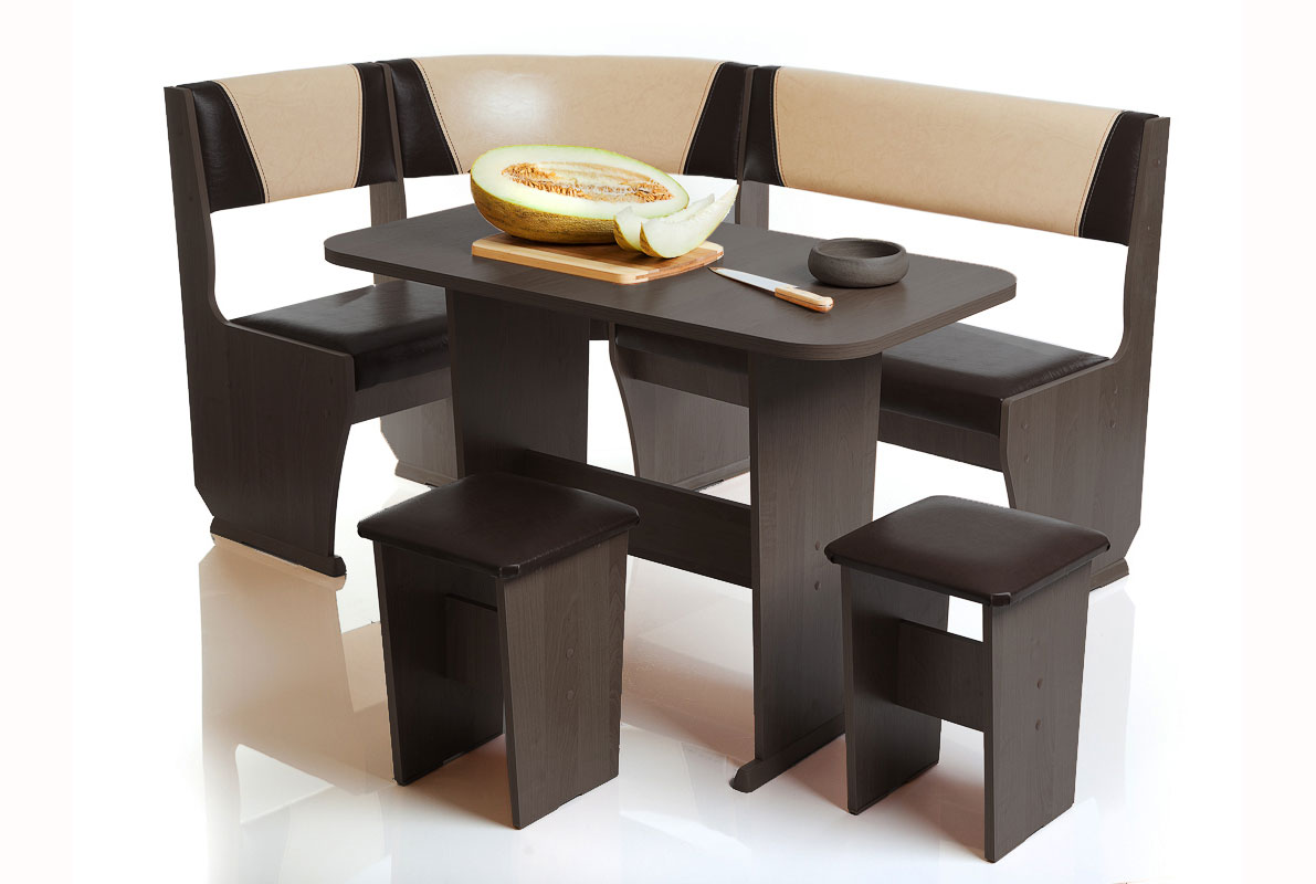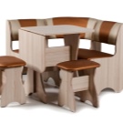 - Mini - dieses Möbelstück besteht aus laminierter Spanplatte, die Sitze sind aus Kunstleder. Diese Ecke ist eine ganze Reihe von Möbeln und umfasst ein Sofa, einen Tisch und zwei Hocker. Gesamtmaße dieser Ecke von 123 cm in beiden Richtungen.