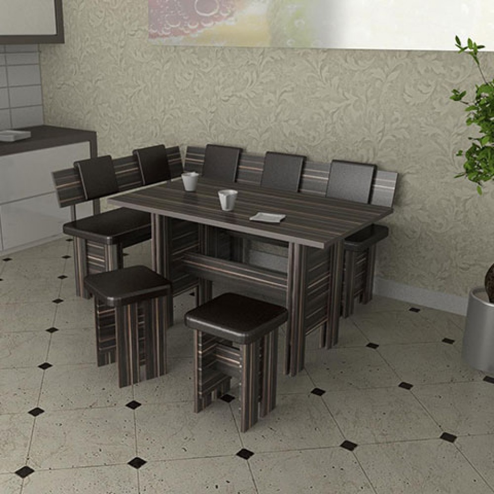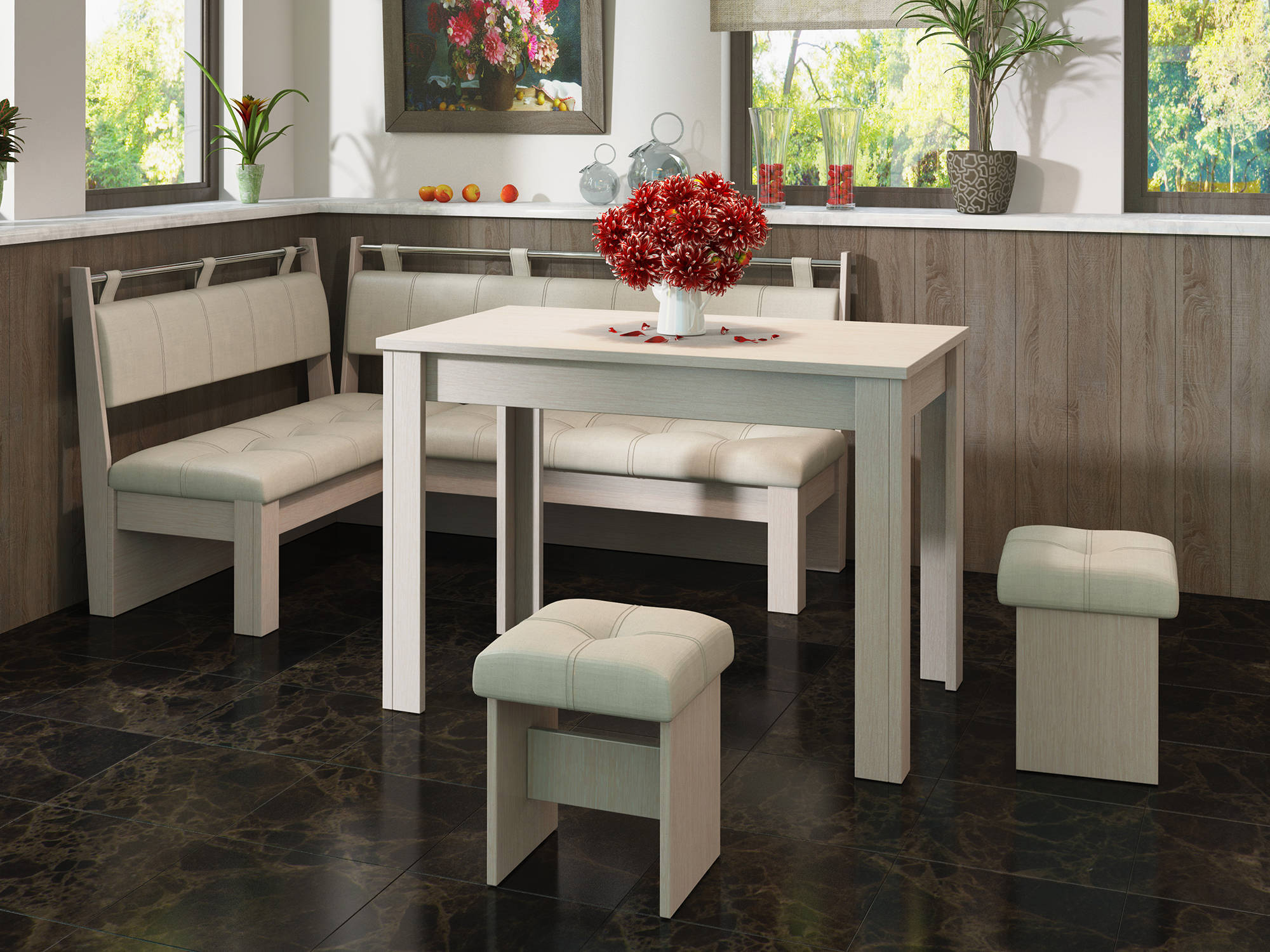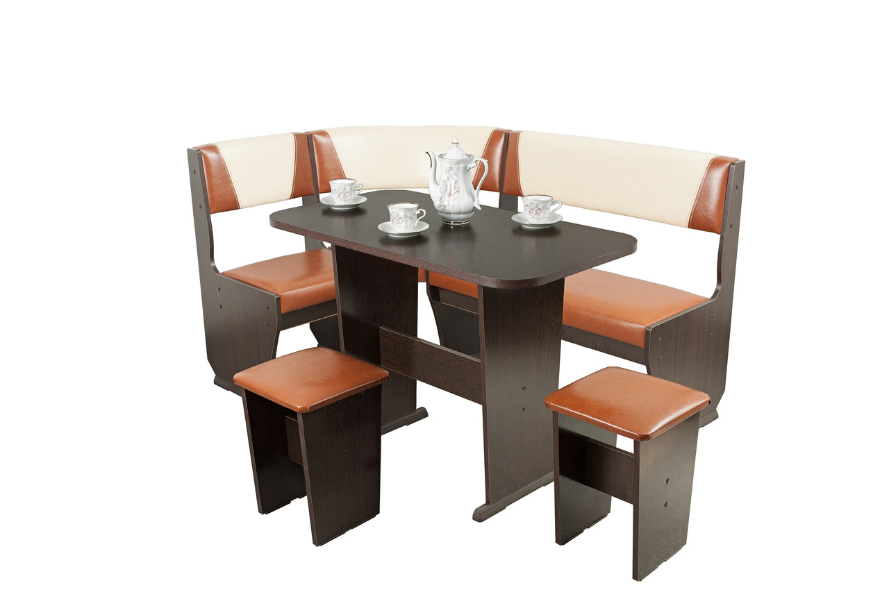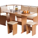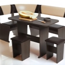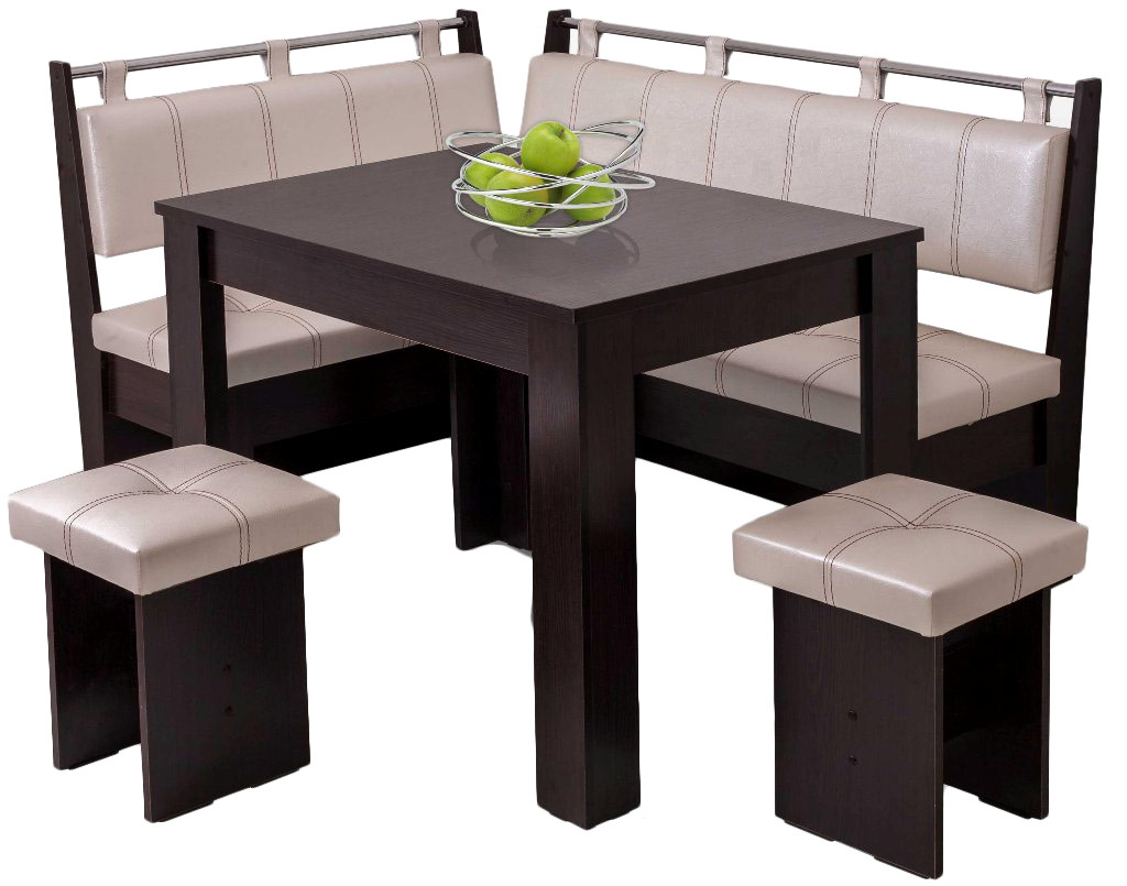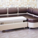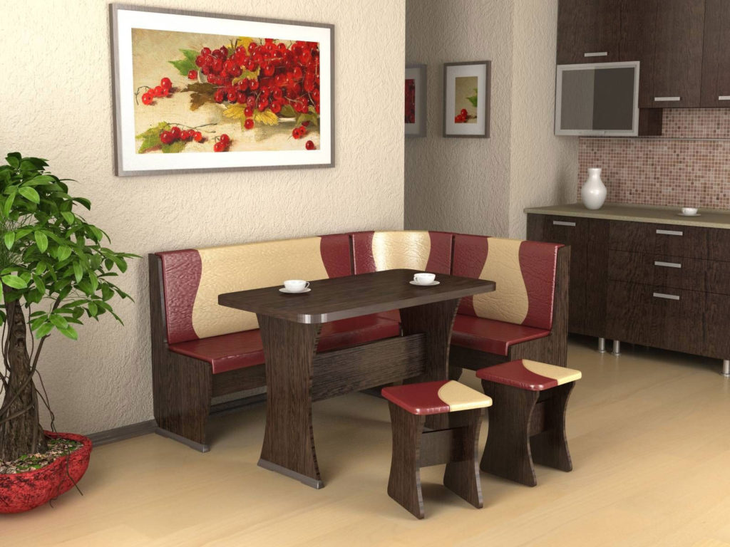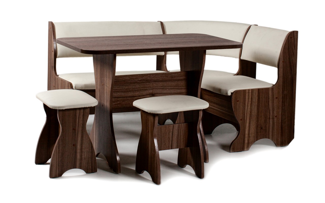 - Mini - dieses Möbelstück besteht aus laminierter Spanplatte, die Sitze sind aus Kunstleder. Diese Ecke ist eine ganze Reihe von Möbeln und umfasst ein Sofa, einen Tisch und zwei Hocker. Gesamtmaße dieser Ecke von 123 cm in beiden Richtungen.