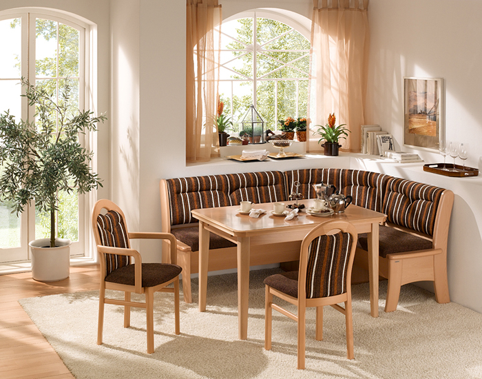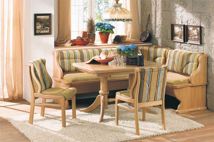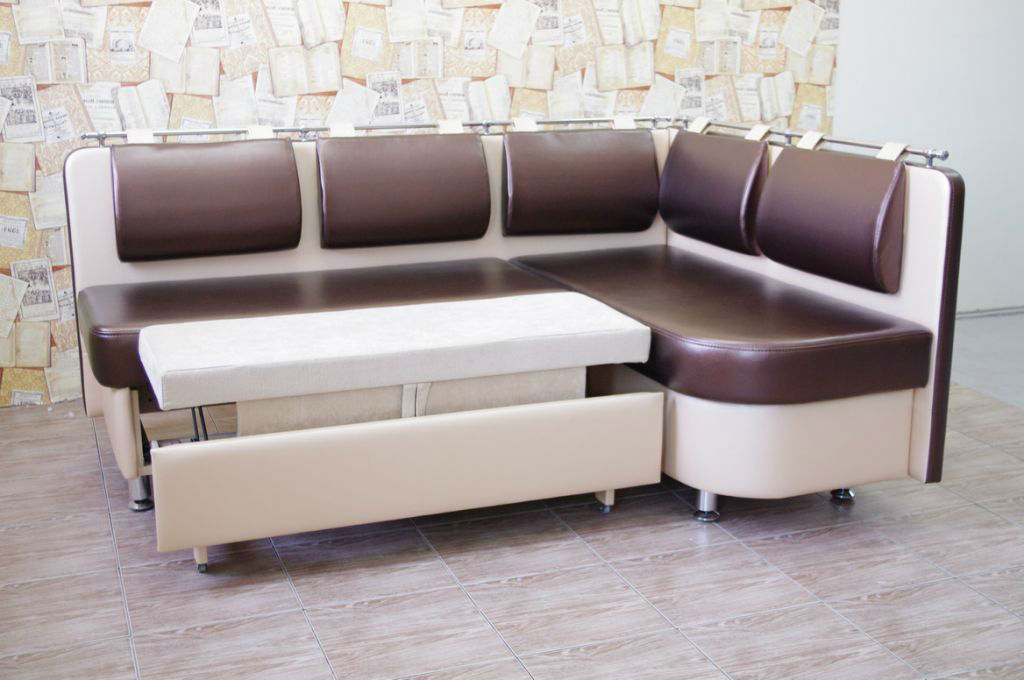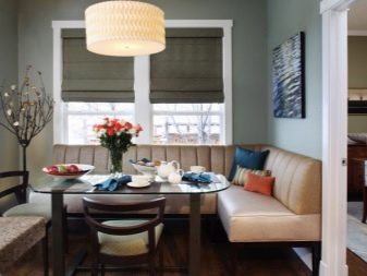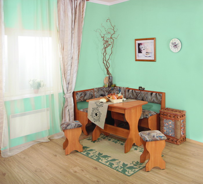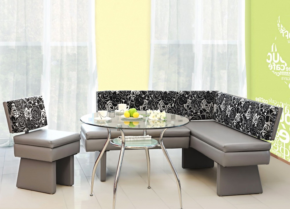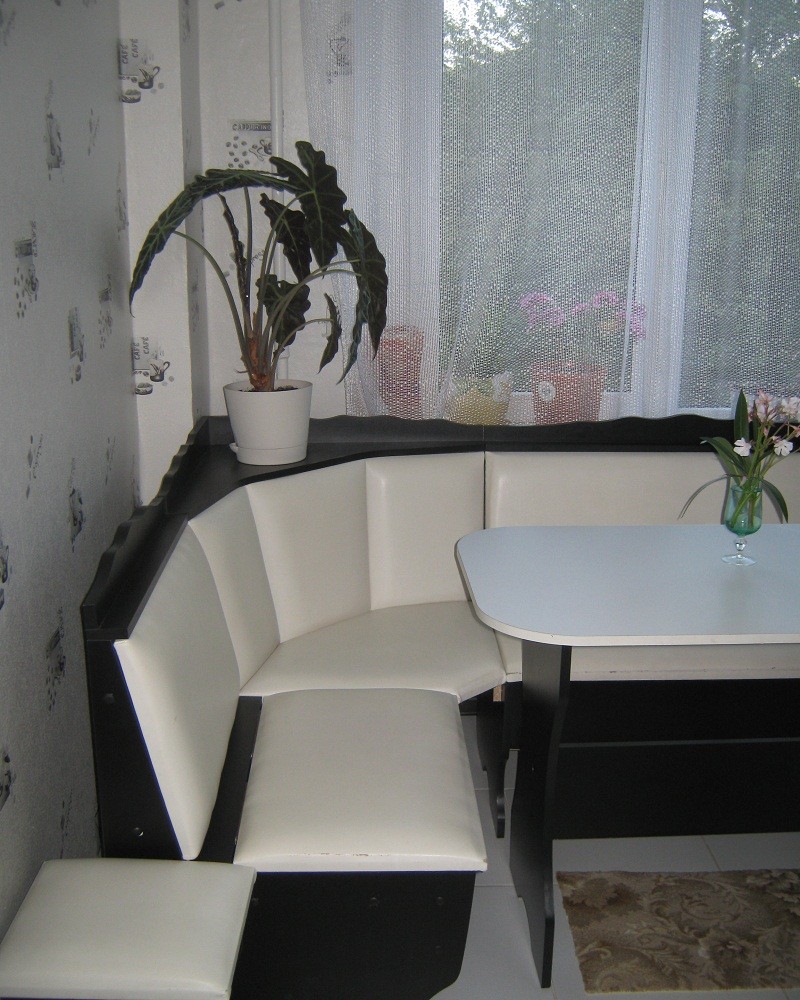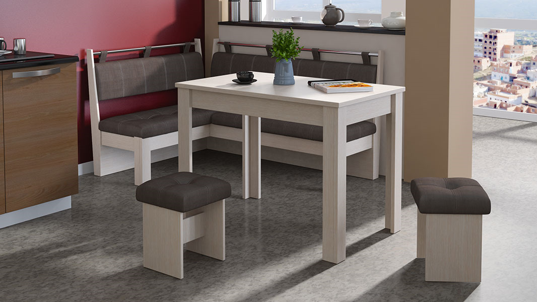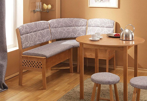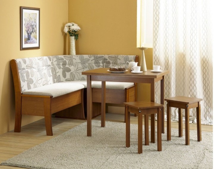Standard-Küchenecken für drei Personen werden als 110 x 160 cm angesehen.Auf einem solchen Sofa fühlen sich die Menschen beim Essen sehr wohl, ohne sich gegenseitig mit den Ellenbogen zu stoßen.