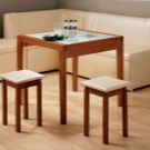 Als zusätzliche Sitze in den Ecken dienen Stühle, Hocker und Hocker. Wenn sie nicht am Tisch essen, werden sie darunter geschoben, und wenn Möbel benutzt werden, sitzen Leute darauf. Um Platz zu sparen, benutzen sie in kleinen Küchen Hocker statt Stühle - sie haben keine Rückenlehnen, das bedeutet, dass es einfacher wird, sich in der Küche zu bewegen, wenn viele Menschen darauf sitzen.