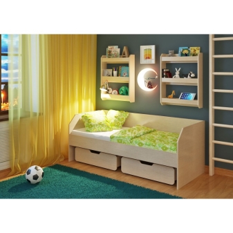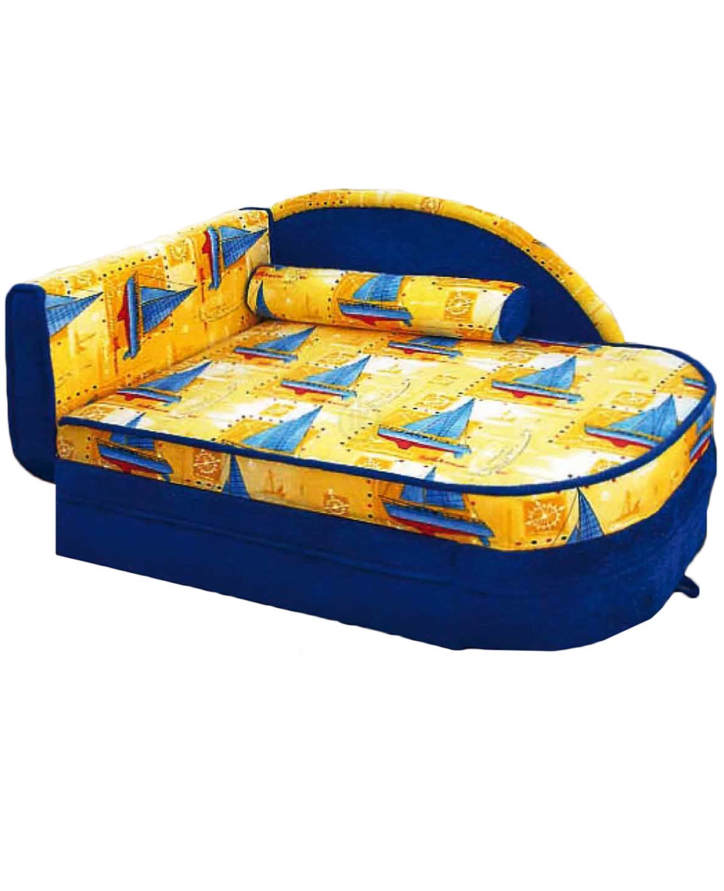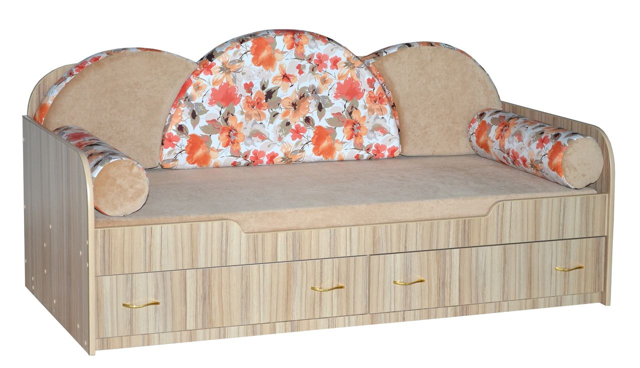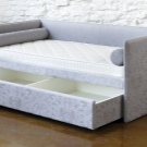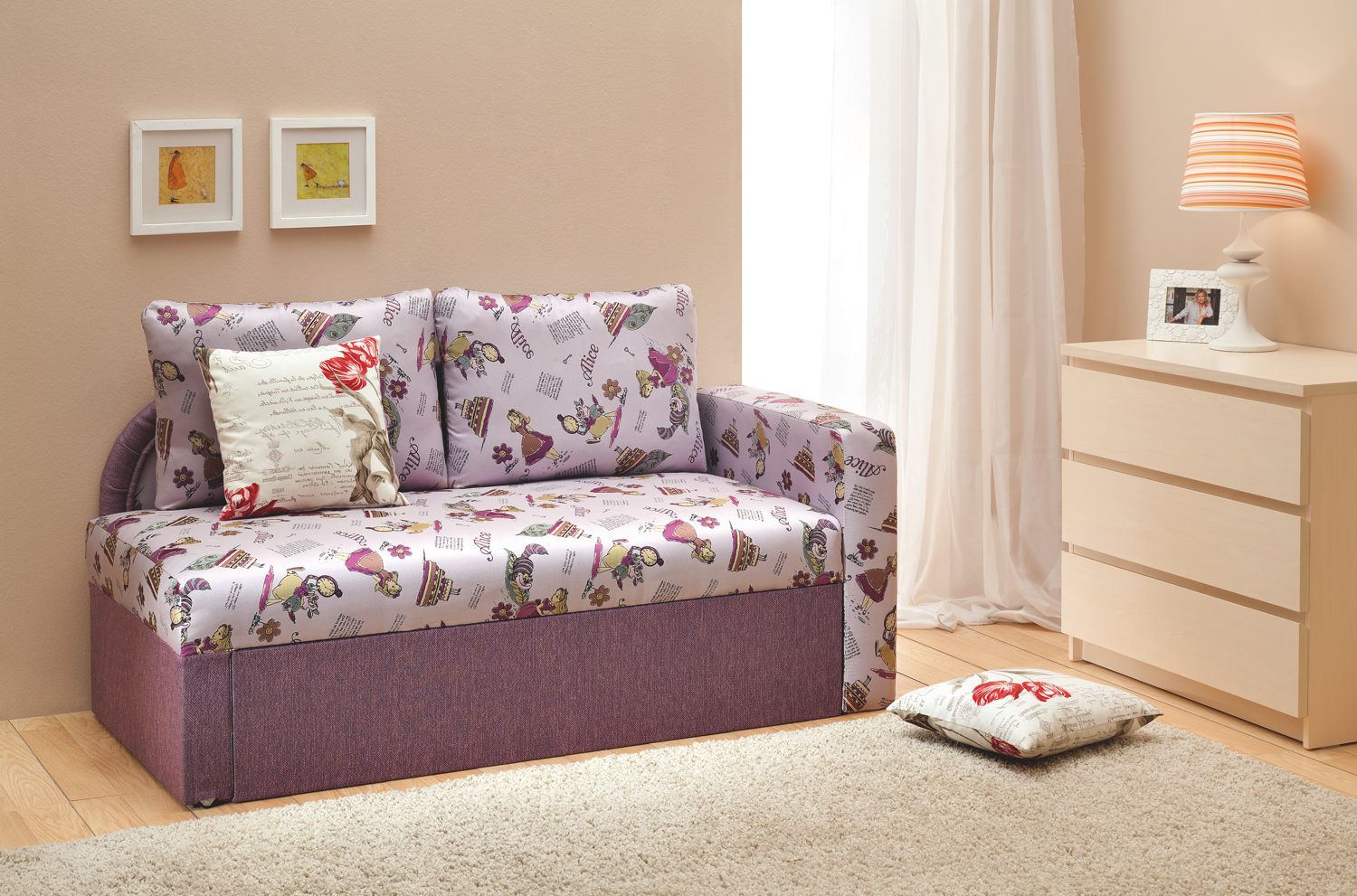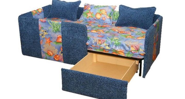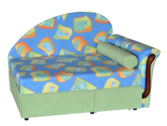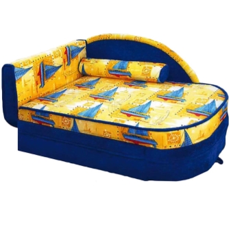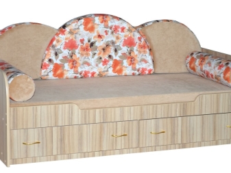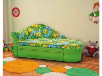 Kinderliege wie ein normales Sofa.Sehr oft ist sein Design frei von Seiten und Rücken. Solche Möbel sind bei den Eltern sehr beliebt, da sie sich durch geringe Kosten und geringe Größe auszeichnen. Wenn eine Faltoption gekauft wird, kann eine kompakte Couch leicht in einen Schlafplatz verwandelt werden, der nicht nur für ein Kind, sondern auch für einen Erwachsenen geeignet ist. Durch die Schubfächer ist zusätzlicher Platz für die Aufbewahrung von Spielzeug, Bettwäsche oder anderem Babyzubehör vorhanden.