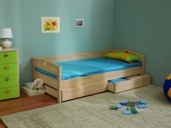 Beim Kauf einer Kinderliege ist es besser, natürliche Holzarten zu bevorzugen, da dieses Material am umweltfreundlichsten ist und keine allergischen Reaktionen verursacht. Holzmöbel enthalten auch keine schädlichen chemischen Elemente und Verbindungen, die den Körper und die Gesundheit des Kindes beeinträchtigen. Die Budget-Option ist eine Ottomane aus Kiefer. Seien Sie aber darauf vorbereitet, dass sich Kiefernholz nicht durch lange Lebensdauer unterscheidet und sich schnell von aktiven Spielen, Sprüngen und anderer Unterhaltung trennen kann.