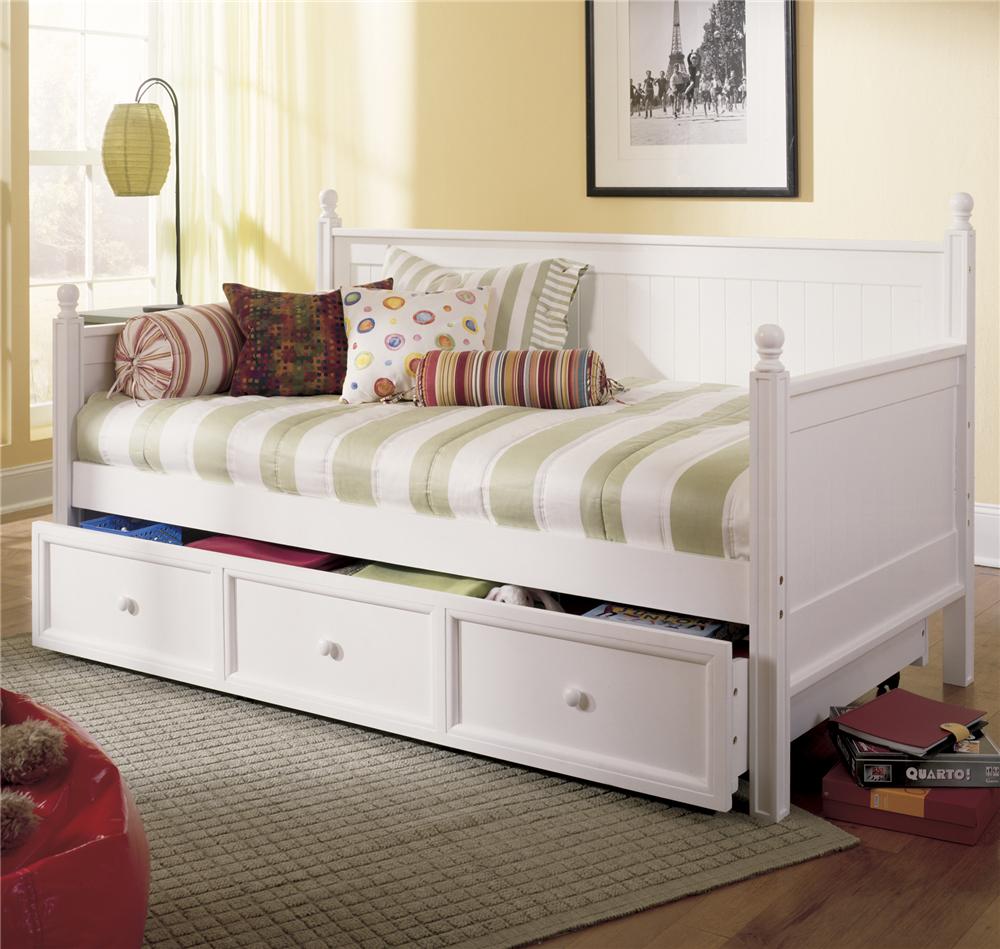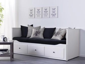 Das Modell ist sehr gefragt.Hemnes Im Innenraum unterscheidet er sich in kompakten Abmessungen im zusammengeklappten Zustand (nur 87 Zentimeter breit) und verwandelt sich in einen geräumigen Liegeplatz, auf den ein Erwachsener problemlos passen kann (Länge - 211 Zentimeter und Breite - 168 Zentimeter). Dieses Modell verfügt über drei geräumige Schubladen, die nicht nur Schlafzubehör, sondern auch alle notwendigen Dinge für einen Jungen oder ein Mädchen aufnehmen können.