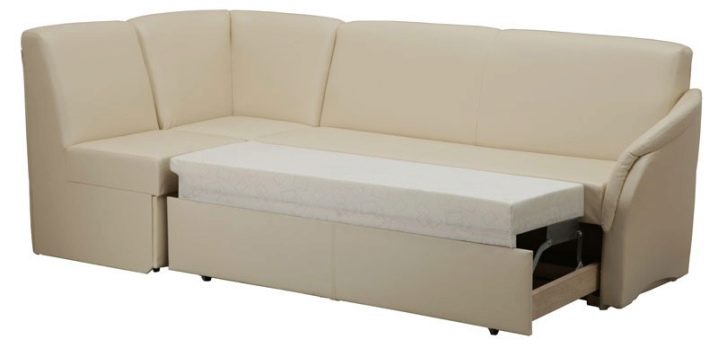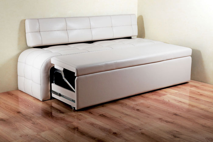Ein weiteres Kriterium, nach dem die Couch geteilt werden kann, ist der Transformationsmechanismus. Viele Modelle werden zunächst in Größen hergestellt, die ausreichen, um eine Person unterzubringen. Es gibt keinen Transformationsmechanismus in ihnen, da es nicht benötigt wird. Faltmodelle mit einziehbarer Kante werden jedoch in kleinen Größen produziert, aber sobald der Mechanismus aktiviert wird, erhalten Sie sofort einen Schlafplatz in den erforderlichen Größen. Solche Möbel eignen sich am besten für kleine Küchenräume.