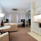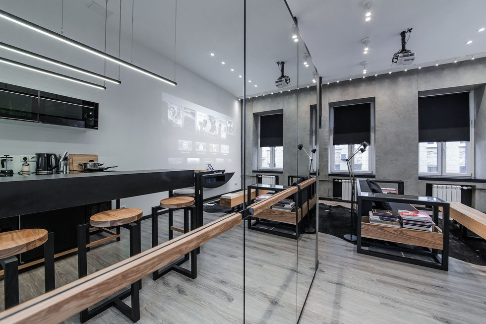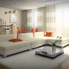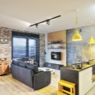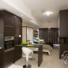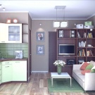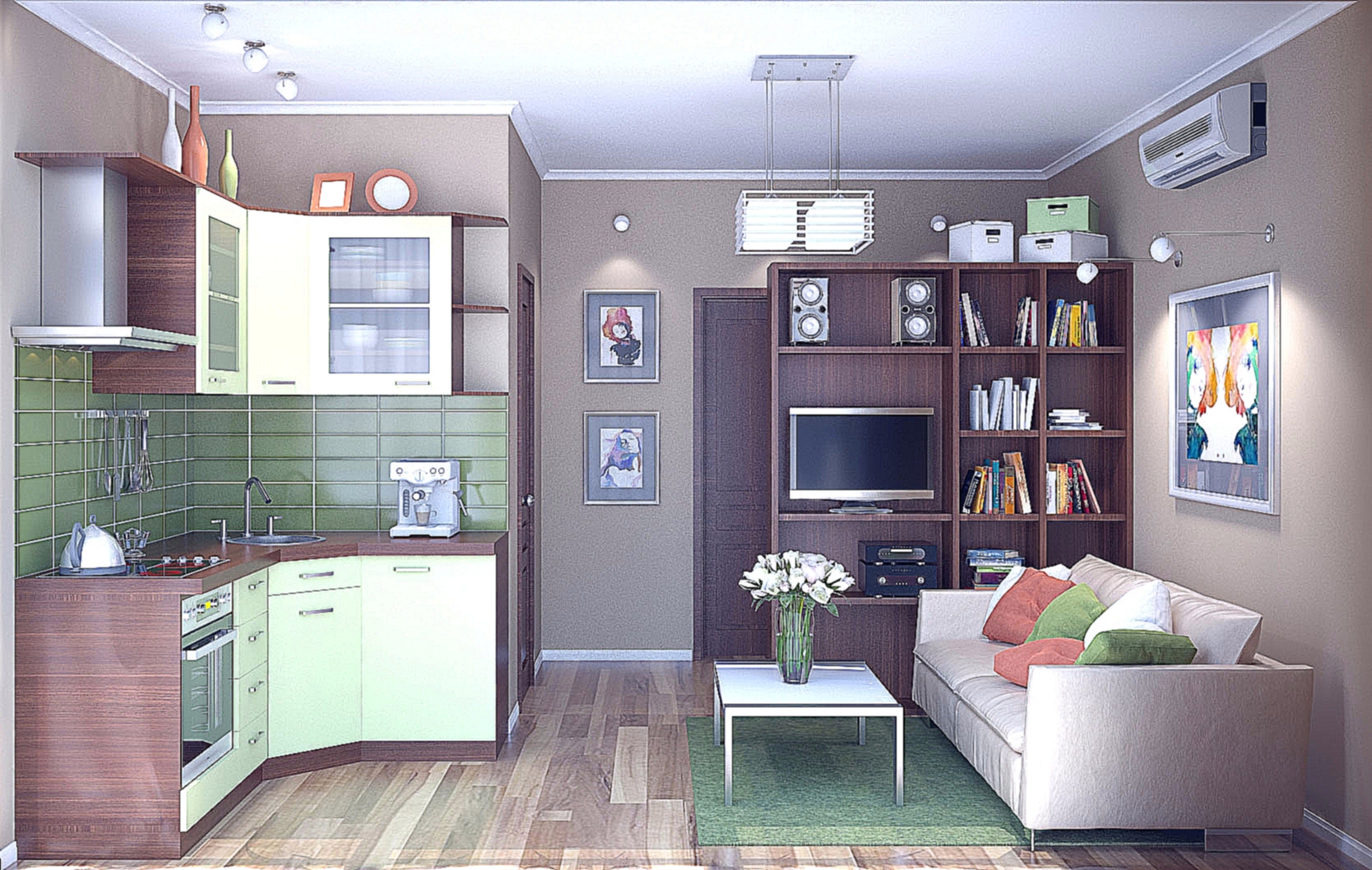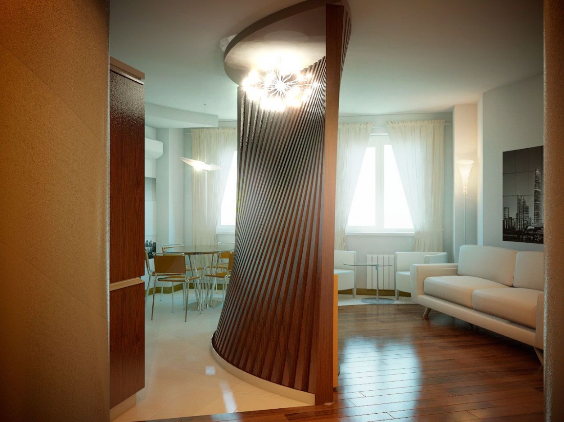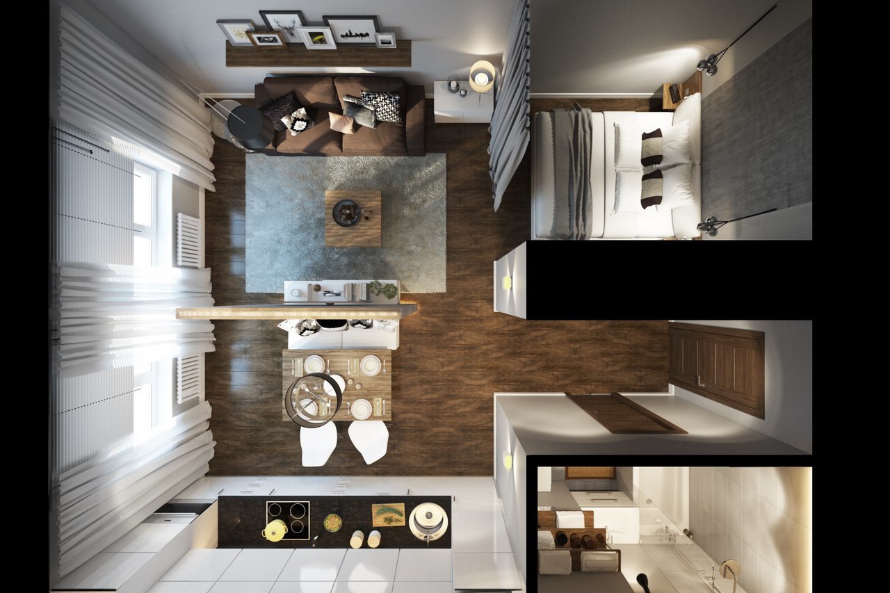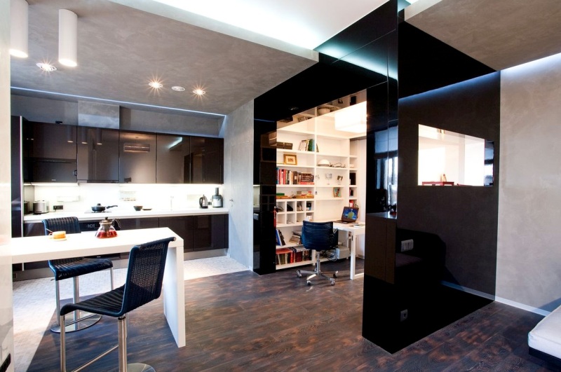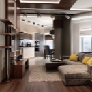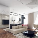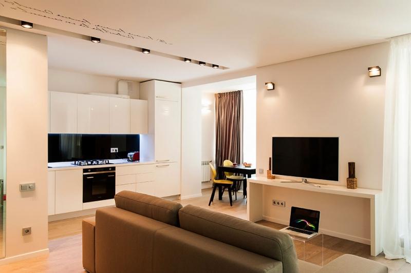 Das Konzept eines Studio-Apartments beinhaltet eine freie Raumaufteilung ohne ausgeprägte Partitionen. Hier erscheint die Einteilung in Zonen eher bedingt. Die häufigsten Bereiche sind Küche und Wohnzimmer. Wenn die Fläche der Wohnung erlaubt, ist es möglich, ein Schlafzimmer und ein Arbeitszimmer zuzuordnen.