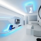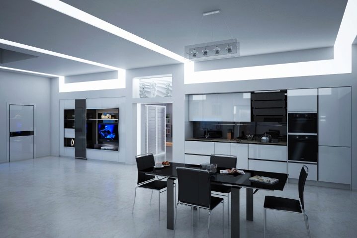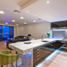 - Zonal. Eine solche Beleuchtung setzt voraus, dass sich eine Gruppe von Leuchten in einem bestimmten Bereich des Raums befindet: ein Lebensmittelbereich, ein Wohnzimmer, ein Arbeitszimmer, ein Erholungsgebiet und andere. Um den visuellen Effekt der Trennung zu verbessern, sind verschiedene Kombinationen von Beleuchtungskörpern und anderen Lichtquellen möglich. Zum Beispiel ist es möglich, eine Zone effektiv voneinander zu trennen, indem LED-Kabel verwendet werden. Solche Bänder können eine explizite oder versteckte Beleuchtung bereitstellen. Ein weicherer Schein wird durch die in den Deckenstrukturen, in der Küche, unter den Wandschränken verborgenen Geräte erreicht.