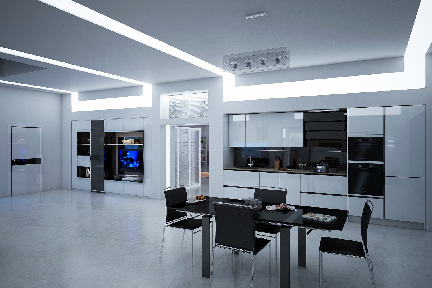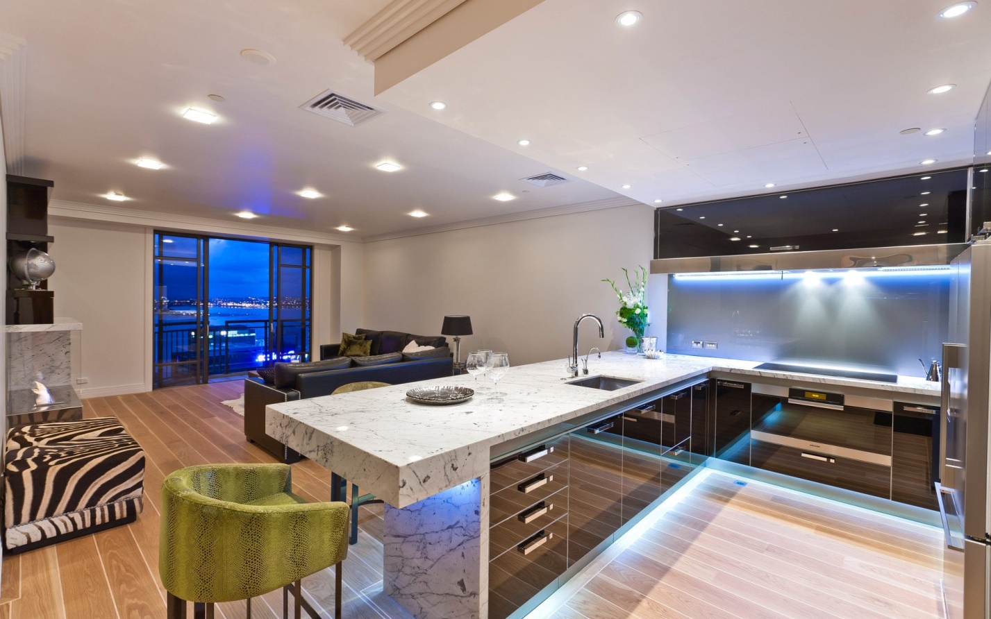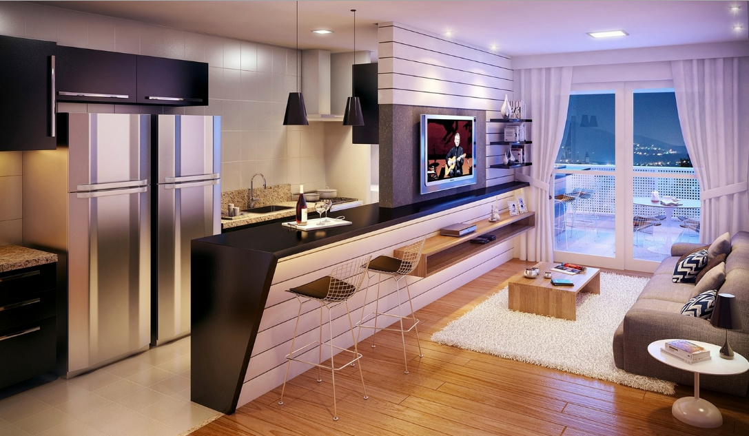 Wenn es sich um ein junges Paar handelt, das einen aktiven Lebensstil führt und nur nachts in der Wohnung auftaucht, sollte der Küchenbereich vielleicht klein gehalten und mit Halogenlampen hervorgehoben werden.