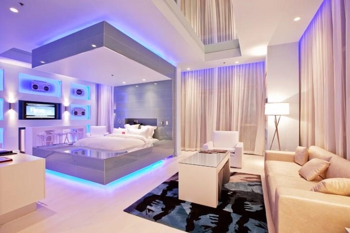 - LEDs. Sie sind sehr langlebig, außerdem erhitzen sie sich nicht und sind nicht gesundheitsschädlich. Die Lichtleistung solcher Geräte ist jedoch extrem gering, weshalb sie nicht als Hauptlichtquelle betrachtet werden sollten.Im Inneren des Studios können sie die Rolle eines Nachtlichts oder einer Hilfsbeleuchtung einzelner Elemente spielen. Ihr schwaches Leuchten kann nach einem anstrengenden Tag die Anspannung lösen und die Augen beruhigen.