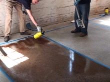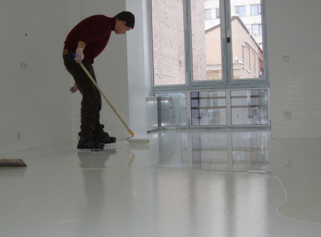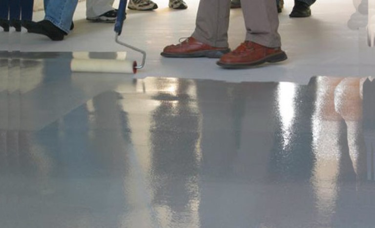 Der Prozess der Anwendung von Polyurethan-Mattlack auf einem Betonboden, siehe unten.