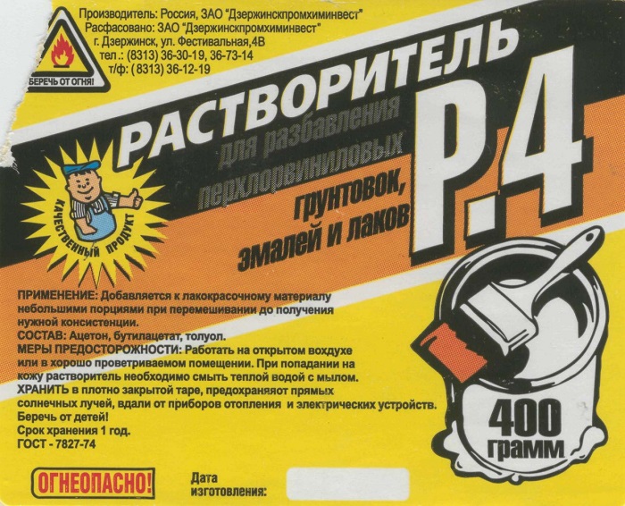 R-4 ist ein Mehrkomponentengemisch auf Basis chemischer Verbindungen, dargestellt in Form einer transparenten Flüssigkeit. Manchmal kann es einen charakteristischen gelblichen Ton haben. Dieses Material enthält keine sichtbaren Suspensionen, weist eine hohe Flüchtigkeit sowie einen spezifischen Geruch auf. Es ist unentbehrlich bei Malerarbeiten., hat Komponenten, die Farben und Lacke auflösen.Nach Angaben der Hersteller macht es die Zusammensetzung wirtschaftlich, die verwendeten Materialien zu verwenden.