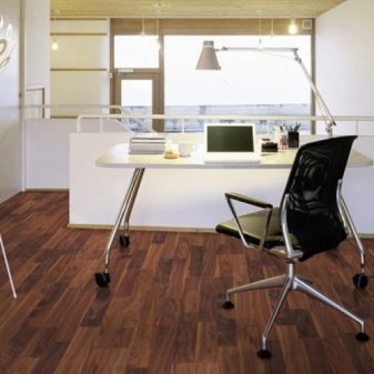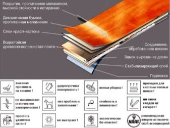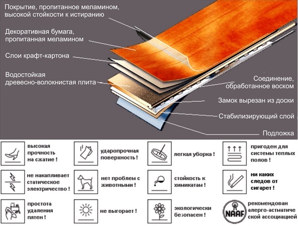 Diese Vorteile legen nahe, dass die Oberfläche des Laminats fast jeder Art von Belastung widerstehen kann, nicht anfällig für Abrieb und Wasser ist, nicht verblasst und sich nicht verschlechtert. Außerdem ist das Material sehr einfach zu verwenden, hat antistatische Eigenschaften, Flecken und Schmutz sind leicht von ihm zu entfernen. Gute Chemikalienbeständigkeit wird ebenfalls festgestellt.