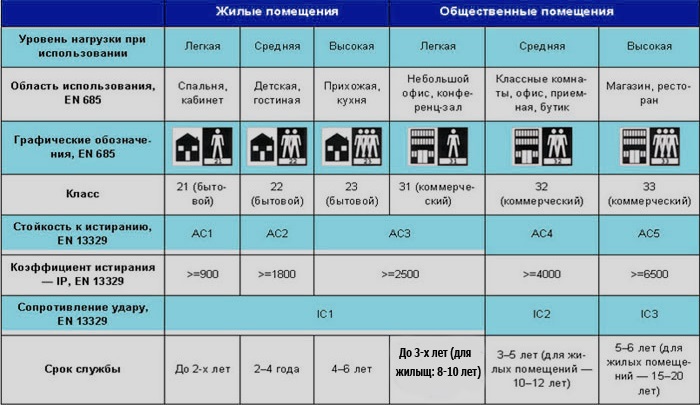 Die Dicke des Laminats kann 5, 8, 10, 12 oder 14 mm betragen. Die Dicke der Schutzschicht 0,6 mm. Eine große Dicke ist in häufig besuchten Räumen angemessen, ebenso wie bei einer minderwertigen Bodenfläche. Der Grad der Verschleißfestigkeit von Lautsprechern für verschiedene Laminattypen ist mit Indikatoren von 3 bis 6, für Lautsprecher der Klasse 34 mit 6 gekennzeichnet.