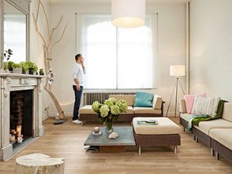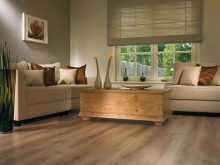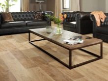 - Die gelungene Kombination von dekorativen Fensterläden, Couchtisch und Laminat verleiht dem Raum einen besonderen Stil und Originalität. Die Oberfläche sieht nahtlos aus und erweitert den Raum optisch.