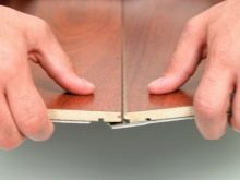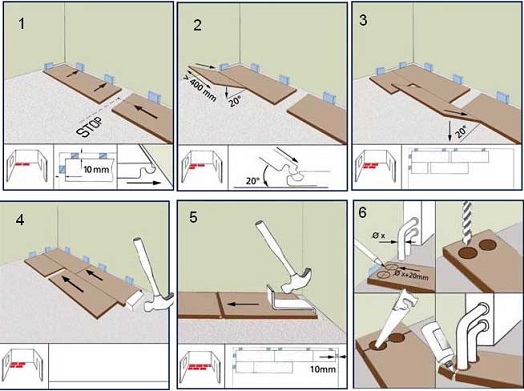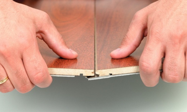 Der nächste Schritt wird das Verlegen von Laminat sein.Bevor man sich darauf begibt, muss man sich daran erinnern, dass diese Art von Bodenbelag dazu neigt, sich unter dem Einfluss von Temperaturänderungen auszudehnen und zusammenzuziehen, und obwohl die numerischen Werte dieser Veränderungen unbedeutend sind, ist es notwendig, Lücken von 8 bis 10 mm zu lassen. Das Verlegen der Lamellen wird empfohlen, um von der Ecke auszugehen. Die erste Platte wird mit einem Kamm gegen die Wand gelegt, und die zweite wird mit einer Nut darauf geschraubt. Dank der Marken-Schlösser ist das Erstellen einer Nummer einfach und erfordert keine besonderen Fähigkeiten.