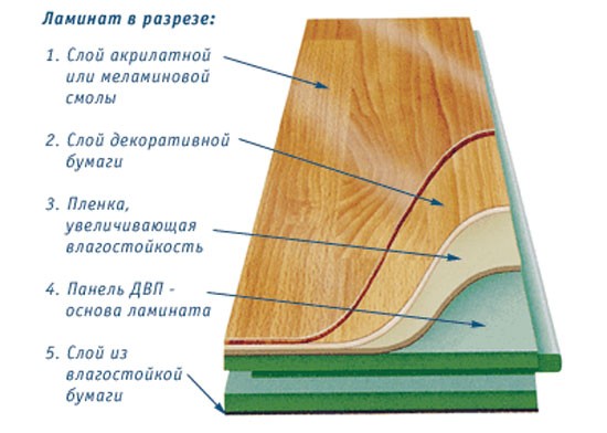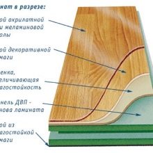 Die Laminatplatte "Balterio" besteht aus einer Basisschicht aus Spanplatten mit hoher Dichte. Darunter befindet sich eine harzimprägnierte Papierschicht, die eine stabilisierende Rolle spielt. Auf der Oberseite der Hauptschicht ist mit dekorativen, auch aus Harz imprägnierten Papier bedeckt und darauf gemustert.Dann ist die Konstruktion laminiert. Als Laminator werden PVC-Folien verwendet, die eine Schutzfunktion bieten und Kratzern, Spänen und Dellen widerstehen.