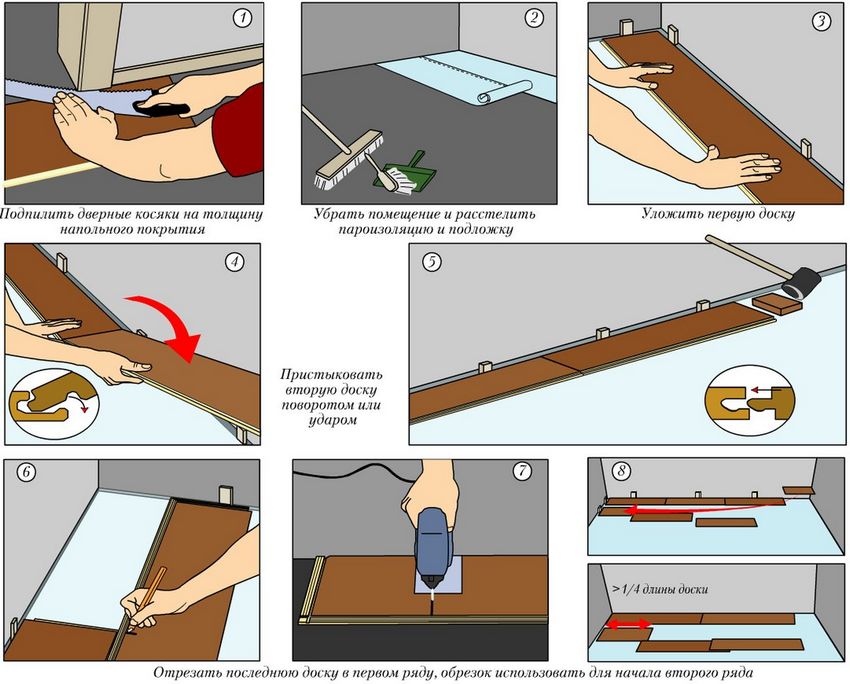 Manchmal ist die Installation von der Tür aus bequemer, während die Lamellen der ersten Reihe entlang der Türöffnung verlegt werden. In diesem Fall müssen Sie unter der Diele mit einer Stichsäge schneiden und unter den Türrahmen einfügen, ohne die Lücken zu vergessen.Nach der Installation müssen Sie die überschüssige Abdichtung entlang der Kante des Laminats abschneiden und mit der Installation von Sockeln fortfahren.