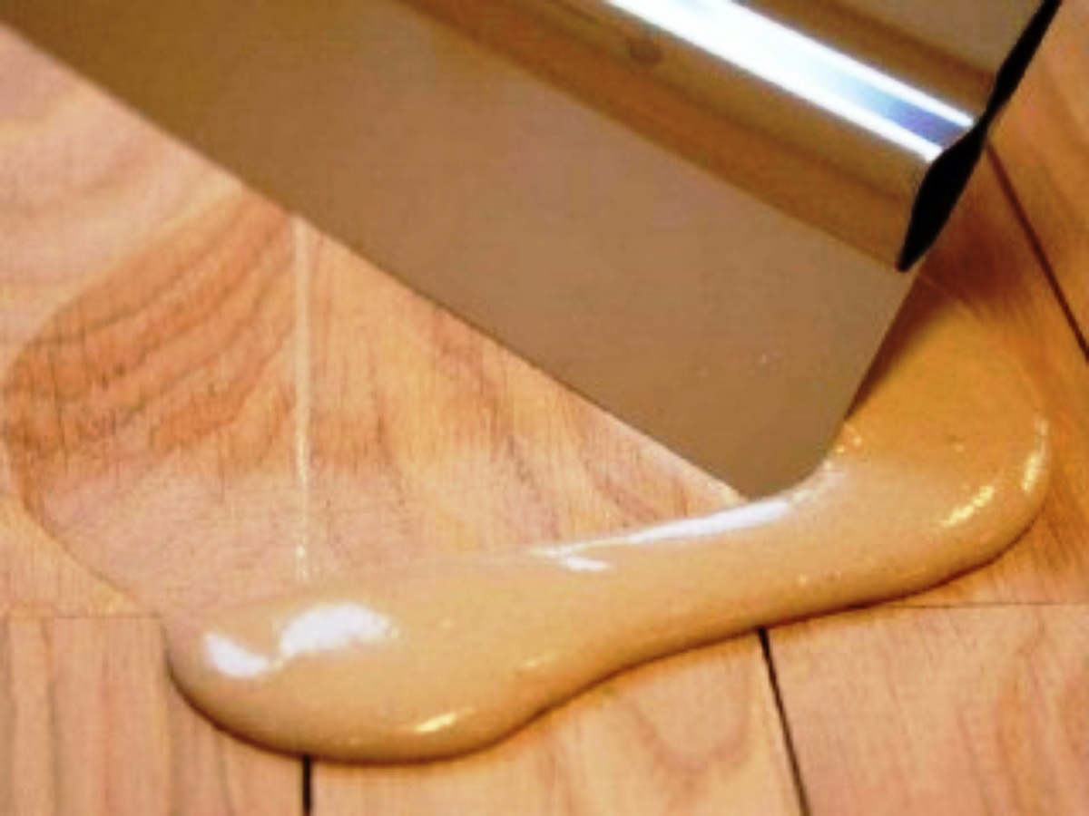 - Spezialisierte Baumaterialien bieten Spachtel für Lamellen, zum Beispiel Reparaturpaste. Dieses Werkzeug ist sehr effektiv, mit verschiedenen Mängeln zu kämpfen. Den Tipps folgend, müssen Sie zuerst das Abdeckband um den Schaden herumkleben und dann die Paste der gewünschten Farbe, die der Farbe des Brettes entspricht, auftragen und die Oberfläche ebnen. Dank der Anwendung von Reparaturpaste wird die Schutzschicht des Bodenbelags wiederhergestellt und beseitigt das Knarren.