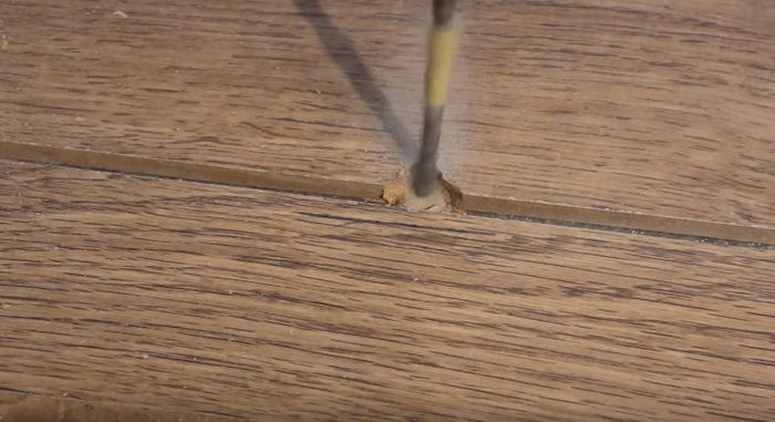 Aber dieser Mangel wird von den Händen korrigiert, ohne auf die Analyse eines Bodens zurückzugreifen. Zuerst musst du herausfinden, woher der Klang kommt, ein kleines Loch in die Lamelle bohren, wo das Knarren zu hören war. Dann wird PVC-Kleber in eine medizinische Spritze gegossen, die in das gebohrte Loch injiziert wird, und für 3 Stunden belassen. Zu diesem Zeitpunkt kann auf diesem Bereich des Bodens nicht bis zur vollständigen Einstellung des Leims gehen. Dann kann das Loch die gewünschte Farbe versiegelt werden.