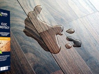 Der in Russland hergestellte Protect Click wurde entwickelt, um das Verbindungslaminat zu schützen. Dichtungsmischung schützt die Oberfläche vor dem Eindringen von Feuchtigkeit und verbessert auch die Verschleißfestigkeit der Beschichtung. Dieses Material kann zur Behandlung des Bodens in Nassräumen oder in stark frequentierten Hallen verwendet werden.