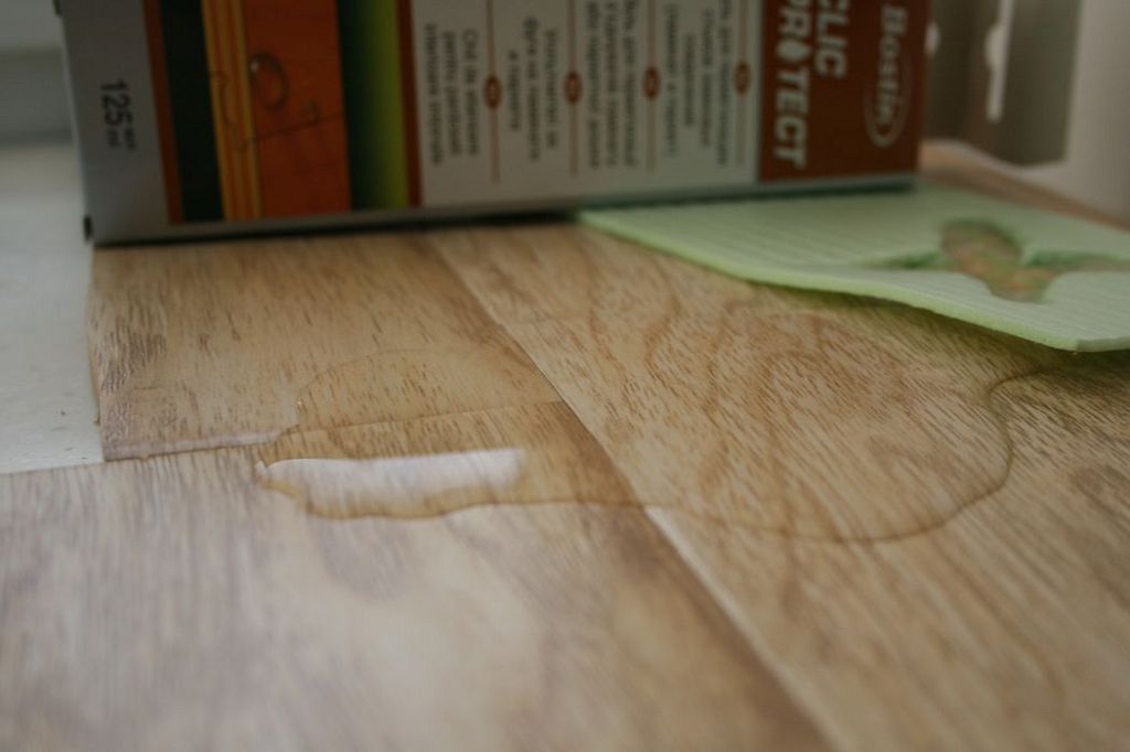 - Nach dem Trocknen bildet das Dichtungsmittel einen dünnen transparenten Film auf der Oberfläche. Überschüssiges auf der Vorderseite des Laminats ist leicht zu entfernen.