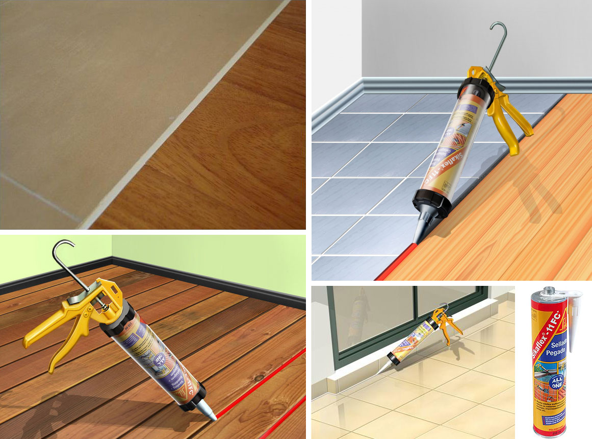 Bei der Verlegung einer neuen Beschichtung oder zur Verstärkung der alten Laminatfugen wird die Verarbeitung von Fugen Laminatdichtstoff durchgeführt. Die Verbindung zwischen Fliese und Laminat ohne Mutter kann mit Silikondichtstoff abgedichtet werden.